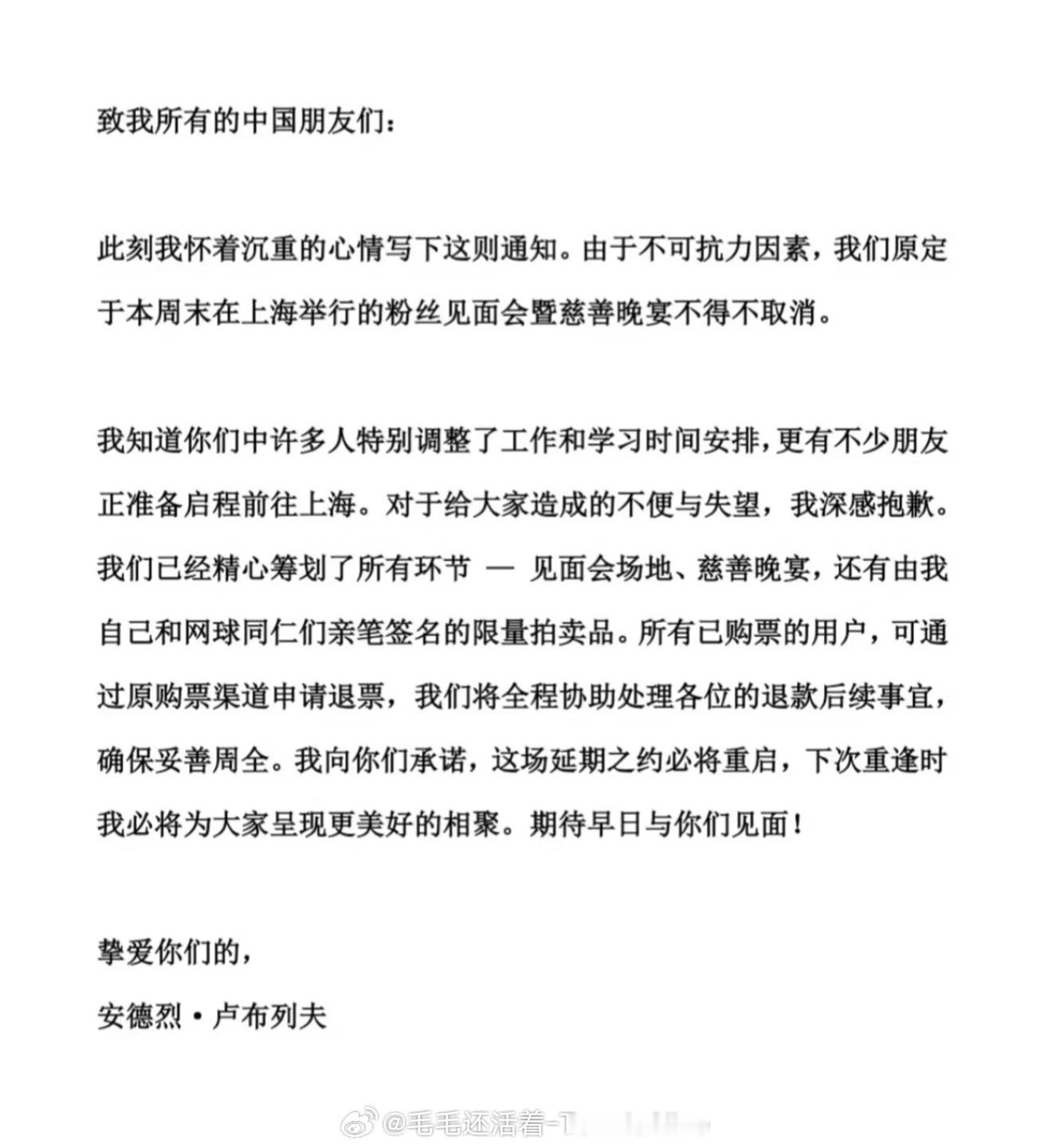 卢布列夫上海见面会取消。这个见面会最高票价4299/3299……当时看到之后也觉得是很震惊。见面会形式和韩国偶像见面会走一样的流程。最高票价可以参与晚宴,而且好像还可以参与拍卖。3299的门票只能参与1v35合影……之前我去的韩国女团的见面会最高票价也只有1280。就想看看到时候会是一个什么样的情况。而且官方说门票已经售罄。结果还有几天就要开始了,见面会反而取消了。官方说是因为一些不可抗力。不知道那些提前买票或者是买机票准备要去的粉丝,机票能不能全额退款。据说十一月底在莫斯科也有他的见面会。但是是以免费的形式举办。在小红书刷到很多粉丝也已经买了门票。卢布的女粉真的挺多挺死忠的,大家还是会为他买单。但是……
