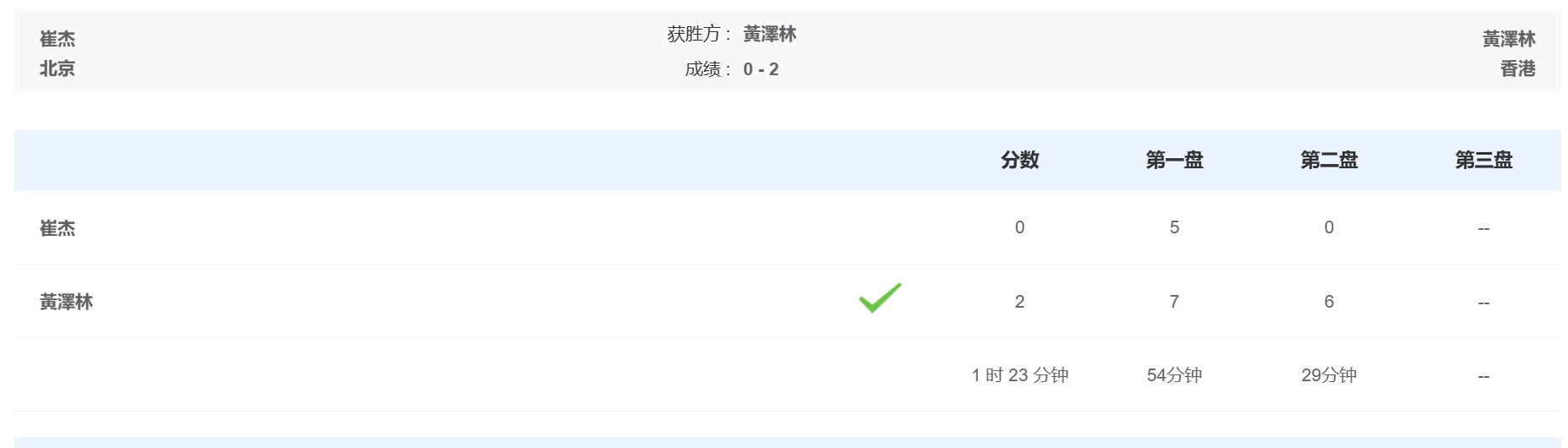 黄泽林7-6、6-0击败崔杰,跻身 男单四强,为香港队锁定一枚奖牌。半决赛静候孙发京和吴易昺胜者。