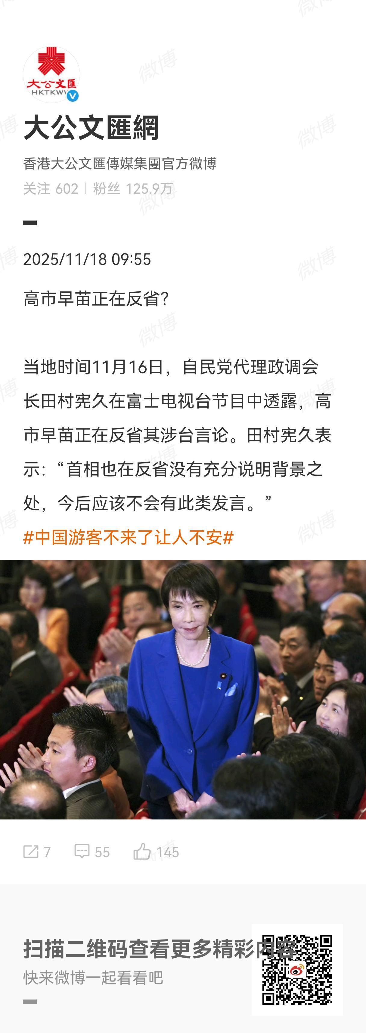 据大公文汇网报道,当地时间11月16日,自民党代理政调会长田村宪久在富士电视台节目中透露,高市早苗正在反省其涉台言论。田村宪久表示:首相也在反省没有充分说明背景之处,今后应该不会有此类发言。这种不痛不痒派一个代理出来轻描淡写地说句话,态度极度不诚恳,根本就没有真正反省和道歉,恐怕过不了关。如果高市早苗及内阁真的想解决问题,高市早苗本人应该发表公开讲话,公开表示自己说错了,并明确表达撤回错误言论,最后再声明今后的日本政府永远不发表类似言论。这样做的目的,就是要她响亮地扇自己耳光,扇那些右翼份子的耳光,立个规矩。用好大声门讲出来的话,必须要用好大声门“吞”回去。