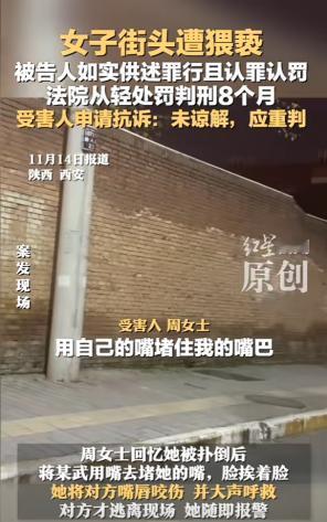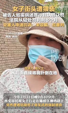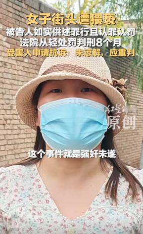 “必须严惩!”2025年3月,陕西西安,一女子逛街时,在街头遭到一男子强制猥亵,在强行拽倒女子后压制其行动,亲吻女子嘴部,女子将对方嘴唇咬伤,并大声呼救对方才逃离现场,事后女子立即报警,次日刑拘。网友:太猖狂了,决不能放过! 2025年3月31日晚上9时,一女子在西安闹市街头行走,并未察觉到一男子尾随其后,直至走到行人不多的地方,该男子突然上前,将该女子扑倒在地,并对其进行了猥亵行为。 男子企图强吻女子并强行脱其裤子,女子虽极力反抗,却因力气不敌而难以挣脱,危急关头,她持续咬住该男子的嘴唇,直至血流到自己脸上,男子才吃痛松口,女子趁机大声呼救,男子因害怕而逃跑,女子最终得以脱险。 事后,女子迅速报警,由于天色昏暗,她无法辨认该男子的样貌,最终,警方根据她口中留有男子的血,在第二天成功才将该男子成功抓获。 男子被抓后对自己的罪行供认不讳,该案一审宣判该男子犯强制猥亵罪,判处有期徒刑8个月,如今,该男子还有半个月即将刑满释放,女子坚持认为该案件属于强奸未遂,希望能够重判对方,该女子已向当地检察院申请抗诉! 女孩子出门在外时,一定要提高自我保护意识,尽量结伴而行,在遭遇危险时能够冷静应对,但仅仅依靠自身的反抗有时是不够的,女孩子可以随身携带一些自卫工具,在遇到危险时能及时发出求救信号并震慑坏人。 大家觉得还有哪些办法能帮助女孩子在遇到类似危险时更好地保护自己呢? 信息来源:《女子街头遭猥亵被告人如实供述罪行且认罪认罚法院从轻处罚判刑8个月受害人申请抗诉:未谅解,应重判》红星新闻