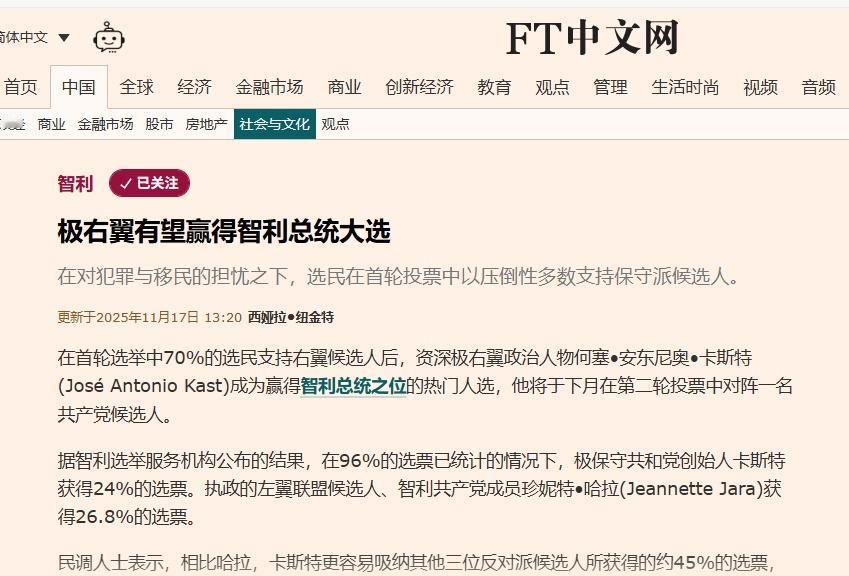 极右翼有望赢得智利总统大选 皮大帅要回归了咩