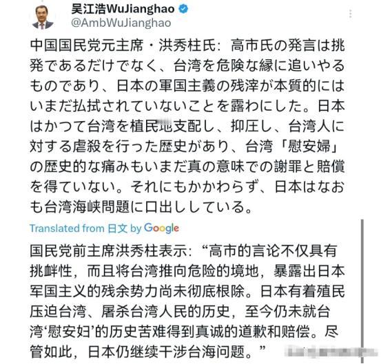驻日大使吴江浩大使再次出来表态!11月18日,吴江浩大使刊出马英九,洪秀柱等人的立场,继续回应日本。其中洪秀柱表示,高市的言论不仅具有挑衅性,而且将台湾推向危险的境地,暴露出日本军国主义的残余势力尚未彻底根除。日本有着殖民压迫台湾、屠杀台湾人民的历史,至今仍未就台湾‘慰安妇’的历史苦难得到真诚的道歉和赔偿。尽管如此,日本仍继续干涉台海问题。 咱们不妨翻开历史这本旧账,看看日本在台湾都干了些什么。 从甲午战争后霸占台湾开始,长达半个世纪的殖民压迫,那是一段血泪史。 台湾同胞为了反抗,前赴后继,结果换来的却是日本殖民者一次又一次的屠杀。 雾社事件大家听说过吧?原住民只是想保住自己的家园和文化,结果被日军用飞机大炮、毒气弹残酷镇压,多少无辜的生命就这么没了。 这笔血债,日本政府认了吗?他们非但没有深刻反省,反而还想方设法地美化、淡化这段侵略历史。 更让人无法容忍的是“慰安妇”问题,这是对女性尊严最野蛮的践踏,是战争罪行中最丑陋的一页。 无数台湾妇女被日军强征为“慰安妇”,她们身心遭受了无法想象的摧残,带着一生的创伤走到生命的尽头。 可日本政府呢?直到今天,他们都没有给这些受害的阿嬷一个真诚的道歉,更别提应有的赔偿了。 这种对历史苦难的漠视,本身就是一种二次伤害,也暴露了他们骨子里对台湾人民的不尊重。 带着这样一屁股还不清的历史债,日本现在却摆出一副“台湾保护者”的嘴脸,这难道不是天大的讽刺吗? 他们根本不是关心台湾人民,他们关心的只是自己的地缘政治算计,想把台湾当成遏制大陆的一颗棋子。 吴江浩大使这次站出来发声,就是要撕下日本伪善的面具,告诉全世界,日本根本没有资格在台湾问题上说三道四。 一个对历史缺乏反省、对受害国人民缺乏诚意的国家,谈何关心台海和平? 他们的所作所为,只会加剧地区的紧张局势,让和平变得更加遥远。 而且,日本国内的政治生态也越来越让人担忧。 这些年,右翼势力在日本是越来越猖獗,他们不断地参拜靖国神社,那是供奉着甲级战犯的地方,是在公然挑战二战后的国际秩序。 他们修改教科书,试图抹去侵略的罪行,给下一代灌输错误的历史观。 这种政治上的右倾化,必然会反映到对外政策上,所以日本政客才敢在台湾问题上如此肆无忌惮地挑衅。 他们以为靠着抱美国的大腿,就可以在东亚横着走,就可以把手伸到中国的核心利益上来。 这种想法,实在是太天真了,也太危险了。 台湾问题纯粹是中国的内政,这是国际社会的普遍共识,也是中美、中日建交的政治基础。 日本当年在《中日联合声明》里白纸黑字地承认了中华人民共和国政府是中国的唯一合法政府,充分理解和尊重中国政府关于台湾是中华人民共和国领土不可分割的一部分的立场。 现在他们倒好,想单方面推翻自己的承诺,这在国际关系里叫背信弃义。 吴大使的表态,其实也是在提醒日本,不要忘了自己的承诺,不要低估中国人民捍卫国家主权和领土完整的决心。 中国已经不是一百多年前那个任人宰割的弱国了。 今天的中国,有足够的能力、有坚定的意志,来粉碎任何形式的“台独”分裂图谋和外部干涉。 日本如果真的希望台海和平稳定,就应该管好自己的嘴,管好自己的人,停止一切干涉中国内政的错误言行。 而不是像现在这样,一边说着要和平,一边又不断地向“台独”势力释放错误信号,火上浇油。 马英九和洪秀柱等台湾人士的表态,也说明了一个道理,那就是岛内还是有很多人是清醒的。 他们明白,“台独”是条死路,而把希望寄托在日本这样的外部势力身上,更是引狼入室。 日本对台湾的“关心”,从来都不是无私的,里面藏着的是他们曾经的殖民野心和现在的地缘图谋。 台湾同胞应该擦亮眼睛,看清日本政客的真实面目,不要被他们的花言巧语所蒙蔽。 历史是一面镜子,它照出了过去的丑恶,也警示着未来的风险。 日本如果不能正视历史,就不能拥有未来。 如果他们继续在错误的道路上走下去,执意要挑战中国的底线,那么最终为此付出代价的,必然是他们自己。 吴江浩大使这次的强硬回应,不仅仅是一次外交辞令,更是一次严肃的警告。 这警告是说给日本听的,也是说给所有想在台海问题上浑水摸鱼的外部势力听的。 中国的核心利益,不容任何人的挑衅和侵犯,这一点,毋庸置疑。