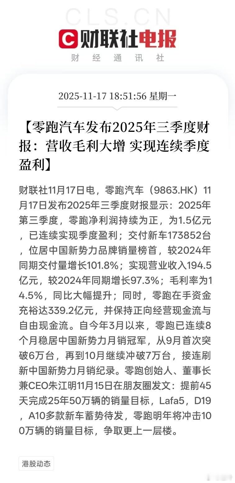昨天去给小零保养,一搜发现家门口新开了一家零跑4S店,心中窃喜。保养等待时看了看零跑准备上新的两款车。一款是:11月21号要在广州车展亮相的A10,据说它是A系列首款全球车型,看起来还是比较精致的,适合刚工作不久的年轻人和小家庭,填补了零跑T03(微型车)与B系列(紧凑型)之间的空白。还有一款是11月27号上市的Lafa5,属于电动小钢炮,款式、颜色、价格同样更适合年轻人,预售价10.58-13.18万。零跑从不被看好到位居新势力第一梯队,成绩还是挺精彩的。销售介绍他们销量连续10个月上涨,10月份销售更是突破7万,11月提前完成了50万的年度销售目标。我只想说难怪我买车的时候等了那么久,他们每个销售都在忙。最最主要的是他们三季度再次盈利,实现了连续季度盈利!为什么我一直关注,一直把它放在自选区域,而我却没有买写到这,我确定有点难过!但还是祝福零跑越来好!祝贺我的C10 累计销量超19万台,十月全球销售超20000台,刷新零跑品牌单车型单月销量纪录!
