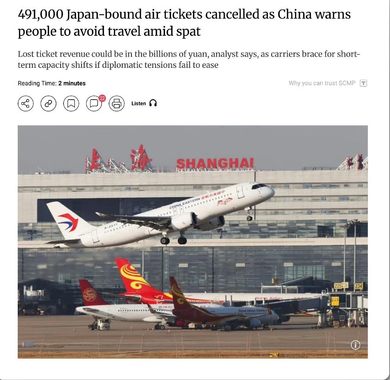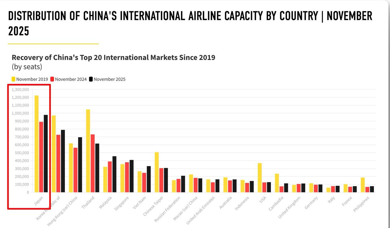 本轮中日外交关系紧张态势升级导致约49.1万张赴日机票被取消,航班取消率一度达到80%以上,取消航班最多的是上海至东京和大阪两个方向。川航这边,成都天府至札幌的航线被取消,且截至2026年3月底前都暂无执飞计划。英国航空情报公司 OAG 的高级分析师约翰·格兰特称:因为中日航线主要由中国航司运营,中国航空公司承受的损失可能会比日本航空公司的损失更大。希望国内的航司们挺过去。