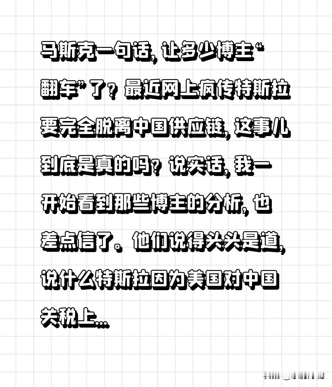 马斯克一句话,让多少博主“翻车”了?最近网上疯传特斯拉要完全脱离中国供应链,这事儿到底是真的吗? 说实话,我一开始看到那些博主的分析,也差点信了。他们说得头头是道,说什么特斯拉因为美国对中国关税上涨,所以打算彻底不用中国产的零部件了。但后来我特意去查了马斯克的原话,才发现根本不是那么回事。马斯克的原话大意是,由于美国对中国关税的上涨,特斯拉在美国销售的车型会减少使用中国产的零部件,这样做是为了降低成本。你看,这跟那些博主说的“完全脱离”差得可不是一星半点。所以啊,咱们在接收信息的时候,还是得保持理性,不能听风就是雨。不信谣不传谣,这事儿真的应该落实到每个人的行动上。毕竟,在这个信息爆炸的时代,真实和虚假往往就在一线之间。 看来,以后咱们吃瓜还是得谨慎点,别被那些博主带偏了。大家对于这件事有什么看法呢?快来评论区一起聊聊吧! 世界首富马斯克 特斯拉马斯克 特斯拉发展前景 埃罗尔.马斯克 特斯拉利润 特斯拉发展技术 马斯克语录