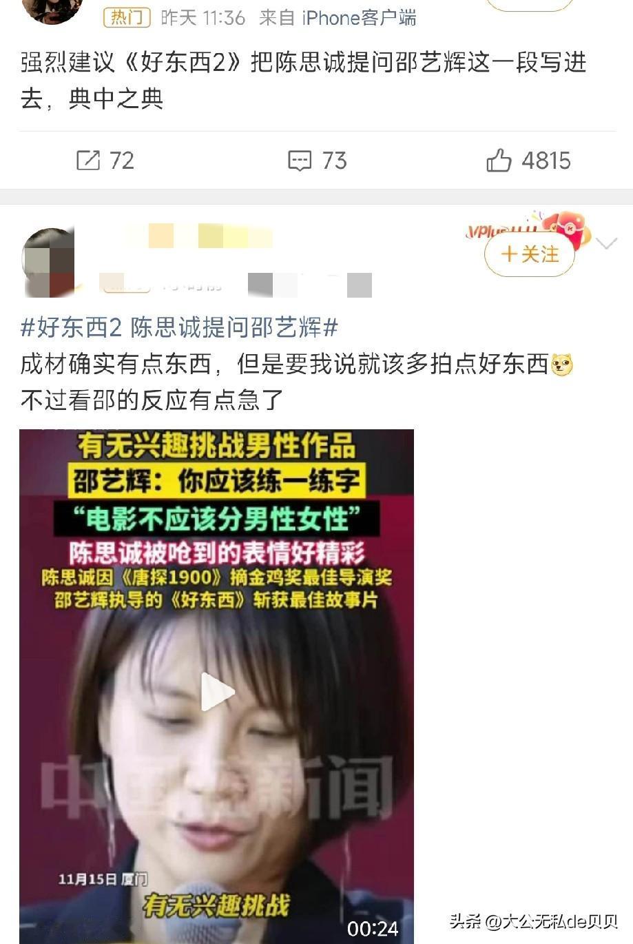 微博上有些人真是太可怕了! 「好东西」的导演拍女性题材电影火了,陈思诚问她,有没有兴趣拍一部男性题材的影片? 这本来是一个挺正常的问题,有没有兴趣邵导都可以直接回答。 但是没想到陈思诚却因为这个问题,好几次被骂上了热搜。 这个女导演在电影上映时,为了票房还说了很多攻击男性的话。 当时都没几个人知道。 现在陈思诚不过是提了很正常的问题,被反复追着吐槽,实在是有点离谱了。
