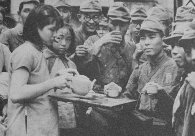 这张照片是侵华日军 “伪亲善” 宣传的虚伪罪证。画面中,两名中国年轻姑娘神情紧张、动作拘谨地端着茶盘,为一群日军递上茶水。她们眼神里的不安与肢体的僵硬,与日军刻意展现的 “平和” 姿态形成尖锐反差。