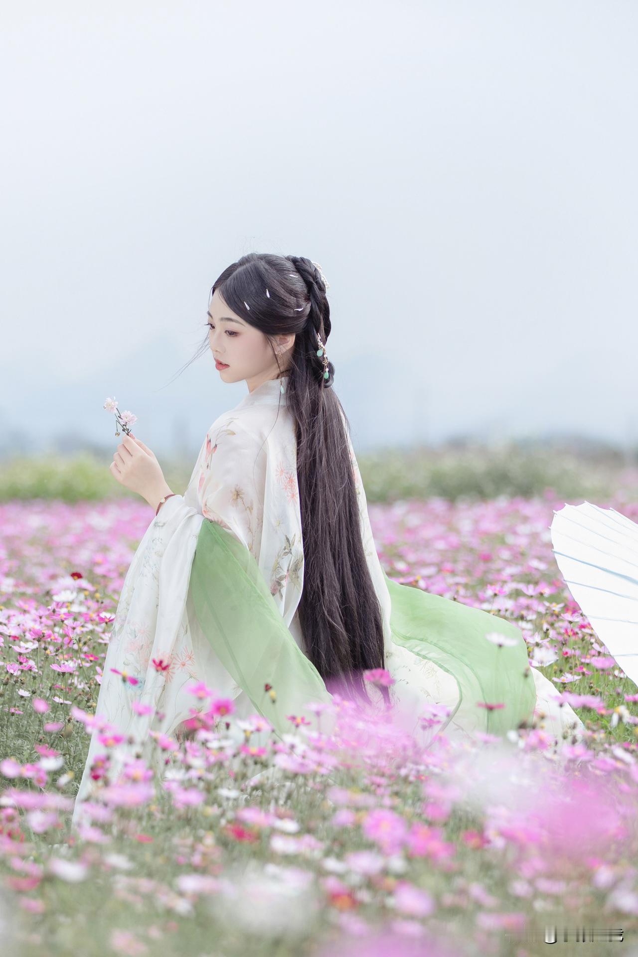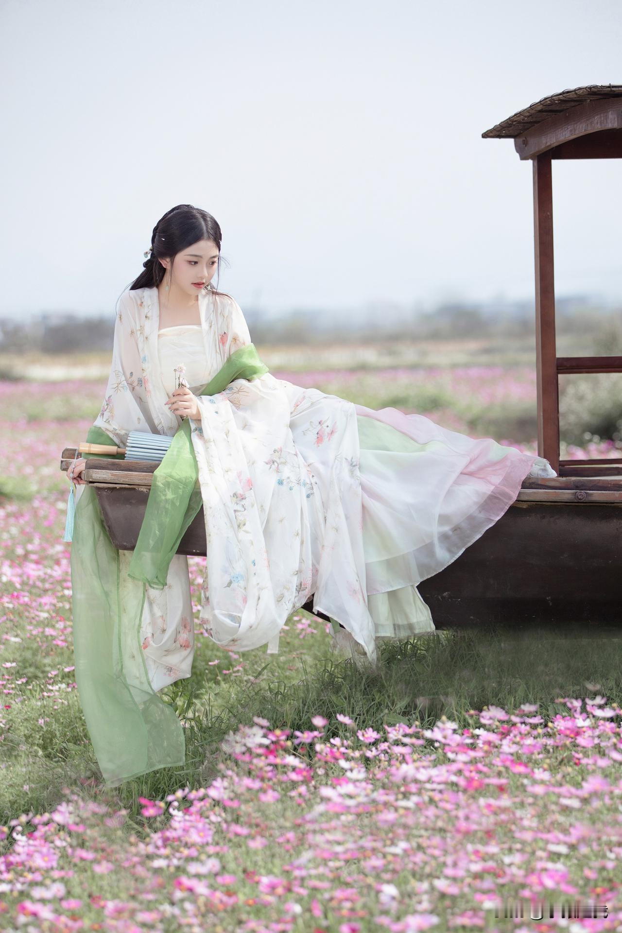 花间奏一曲,梦回一千年。 木舟停在花海中,素衫拖着花影。 头上簪着软玉,手指捏着轻花,风里裹着温柔。 抱着笛子靠在花丛边,拿着花回头望,如烟的柳树、披帛似的草色,衣袂拢尽这一片闲适。 古风诗意裙