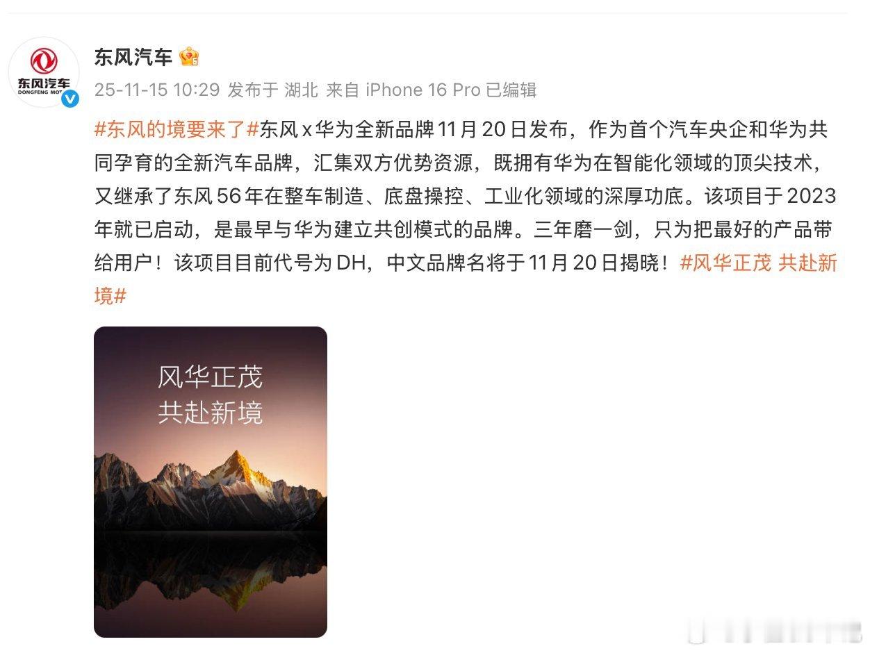 11月20日,东风与华为合作的DH项目新品牌将正式亮相,引爆车圈热议!造车央企深厚技术底蕴碰撞华为智能科技,此前车企与华为合作屡造爆款,这次强强联合又将带来哪些惊喜?值得期待!