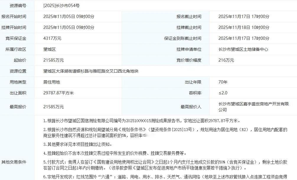 湘江西岸的大泽湖片区,正以“省会新地标、湘江未来城”的姿态强势崛起,而这场城市升级的浪潮中,嘉宇控股的加码布局尤为引人注目。2025年11月18日,嘉宇以21585万元底价摘得望城区[2025]长沙市054号地块,楼面价3623元/㎡,继嘉宇璟琇大泽湖之后,再度重仓这片集生态、科创与高端配套于一体的价值高地。 此次出让的地块坐落于大泽湖街道银杉路与雅旺路交叉口西北角,地处大泽湖南岸核心观景带,29787.87㎡的居住用地被3000亩近自然湿地公园环抱,一线临湖无遮挡的视野,能将湿地树岛、花海草坪的生态盛景尽收眼底——目前公园一期已正式开放,成为长沙市民打卡的“生态绿芯”。更难得的是,地块容积率≤2.0,低密属性与湖景资源叠加,预示着未来将打造高端改善型住区,与隔邻相望的嘉宇璟琇大泽湖(在售价9700-10500元/㎡)形成联动,巩固嘉宇在片区的市场话语权 。 配套的成熟度更让地块价值锦上添花。交通方面,距离地铁4号线北延线星月北路站约600米,这条串联滨水新城与主城的“融合之脉”已完成地连墙施工超80%,预计2028年底建成通车,届时15分钟可达市政府商圈;教育资源堪称“豪华”,湖南第一师范大泽湖学校(公办九年一贯制)已开学,师大附中大泽湖校区2025年正式招生,“房户一致”提下可享受就近统筹入学政策 ;医疗配套则有已投入运营的长沙市第四医院滨水院区,一路之隔即可享受优质医疗服务。 值得关注的是,地块挂牌条件暗藏“绿色密码”——需落实浅层地热能利用要求。作为湖南省浅层地热综合利用示范区,大泽湖片区通过水源热泵技术实现集中供冷供暖,较常规能源节能50%-60%,每年可减少大量碳排放,此次嘉宇新项目将融入这一生态体系,打造低碳宜居社区 。此外,住宅阳台统一封闭设计、毛坯销售均价按长沙政策监制等要求,也将保障项目品质与房价稳定性。 从片区发展来看,大泽湖作为全国首个海归小镇核心区、全球研发中心城市基地,目前已集聚中交湘江总部、大陆希望华中总部等产业项目,37个重点配套项目加速落地 。嘉宇此次再度落子,既是对片区“生态+科创+配套”三重优势的认可,也将通过双盘联动,深度参与这座未来城的人居建设。随着交通、教育、产业的持续兑现,这片兼具自然禀赋与发展潜力的热土,正成为长沙高端居住的新目的地。