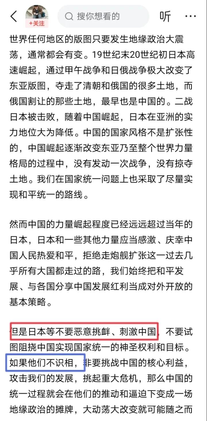 近日,胡锡进发文评论日本的琉球问题,老胡为日本如何保住冲绳而积极建言献策。 首先,胡锡进告诉日本不要犯傻,比如“日本千万不要自作孽”、“日本不要恶意挑衅、刺激中国”、“日本千万别太嚣张”等等。此刻老胡仿佛化身一位慈祥的长辈,对小日本这个晚辈谆谆教诲,又是“千万”,又是“不要”,唯恐这个小日本冲动犯错似的。 其次,胡锡进认为日本目前尚未犯错,对日本挑衅的质疑仅存在于“如果”的假设中,比如“日本如果搅动区域内的冲突”、“如果他们不识相”、“如果日本恶意贱招”等等。此刻老胡仿佛化身一位护犊的长辈,口口声声辩解日本并未犯错,因为那些质疑都是“如果”而已。 再次,胡锡进表示“美国睁一眼闭一眼,让冲绳继续留在了日本的版图上”,注意这里“继续”二字的意思是连续进行、不中断进程。可见老胡认为琉球以前处在日本的版图上,现在仍然留在日本的版图上,所以才有“继续”的说法。 那么胡锡进对日本如此循循善诱,唯恐它不小心犯错弄丢了琉球,老胡为何如此替日本着想呢?