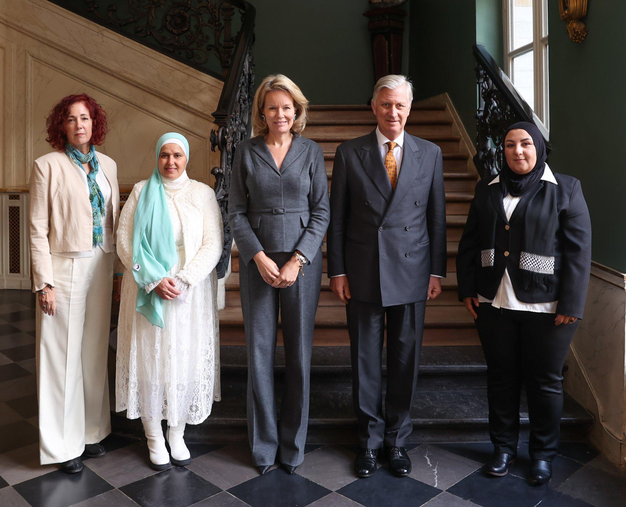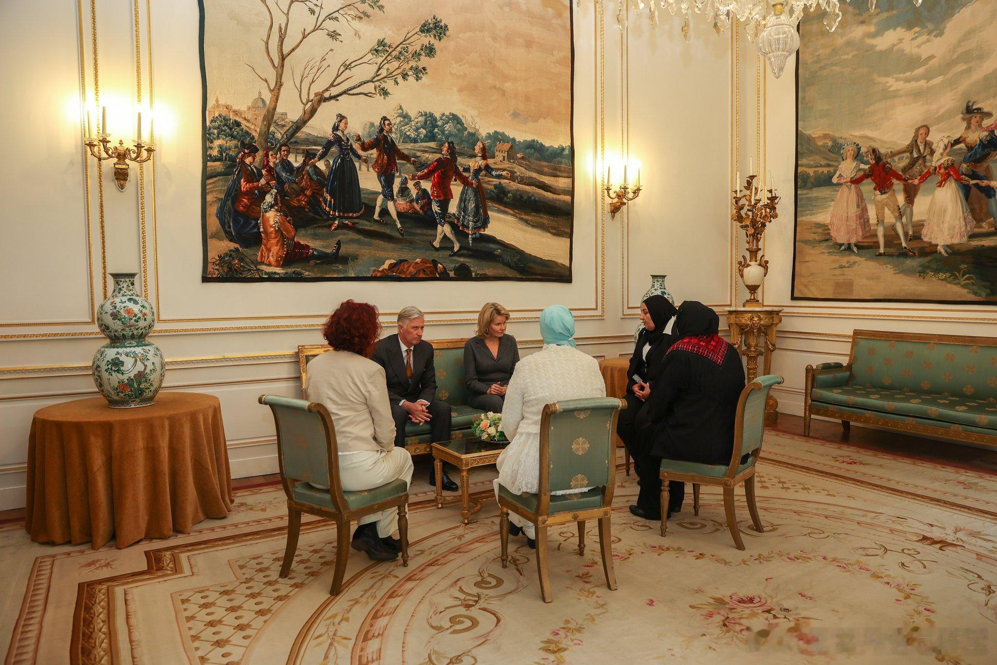2025.11.17 比利时国王夫妇在布鲁塞尔皇宫接见“争取和平妇女”(以色列)和“太阳妇女”(巴勒斯坦)组织的代表,两个组织致力于结束中东地区的暴力冲突,促进对话,增进相互理解,并为以巴冲突寻求公正的解决方案,以求该地区实现和平持久的共存,玛蒂尔德的裤装来自Natan。