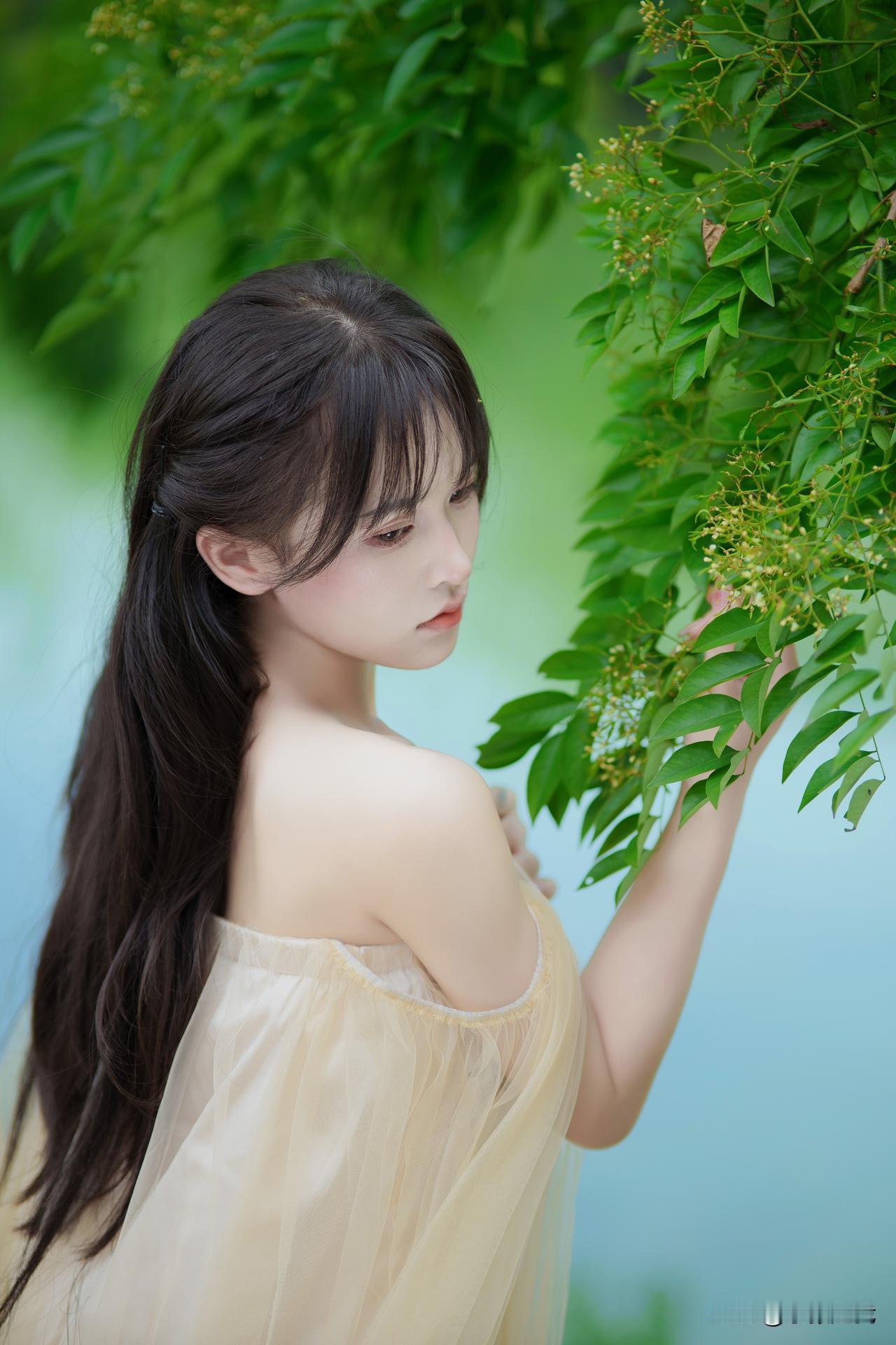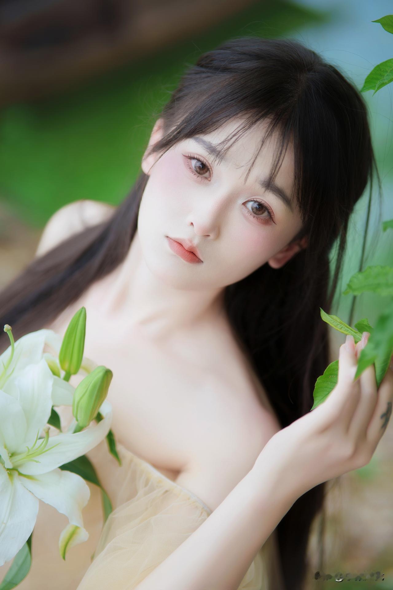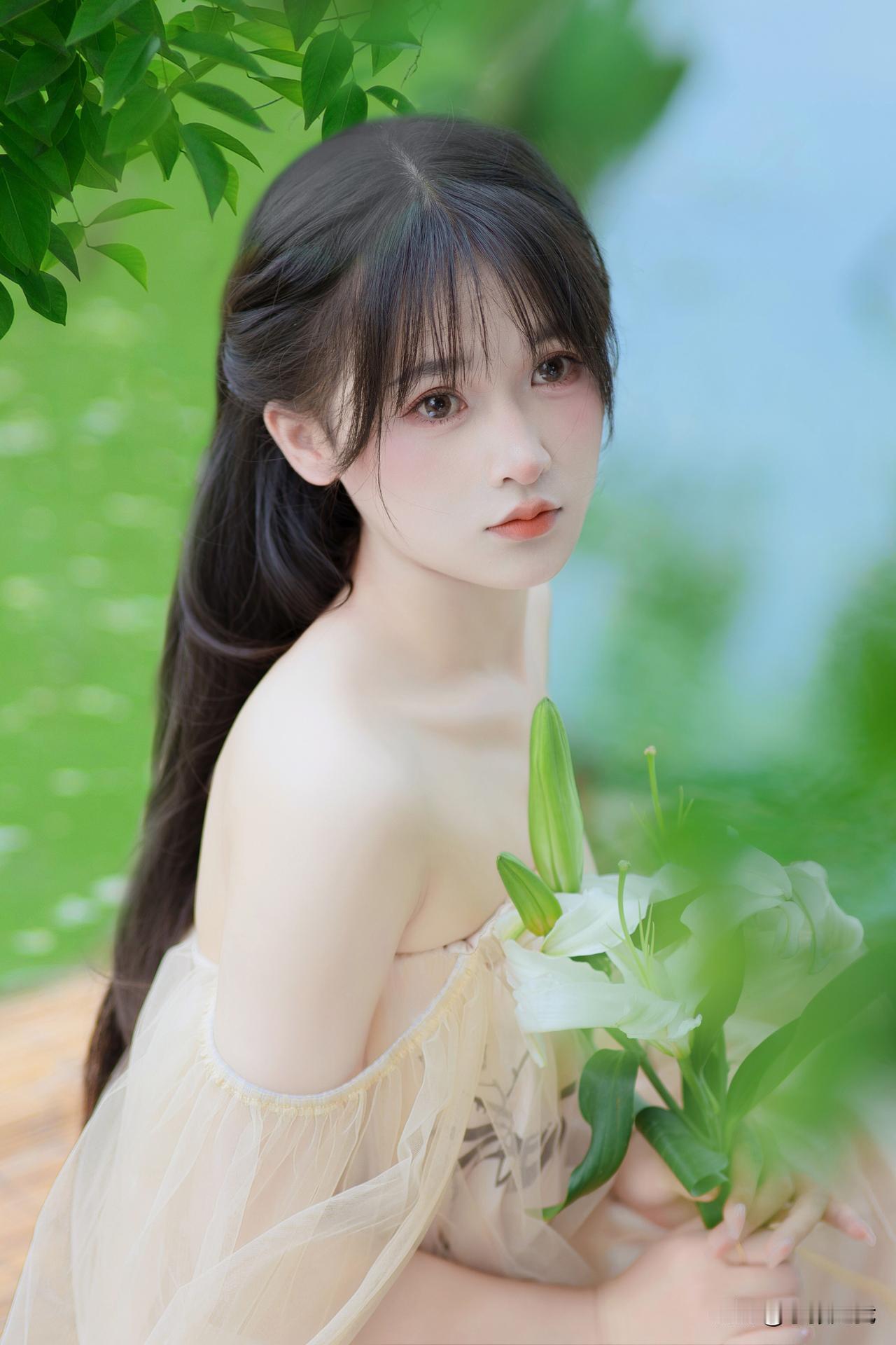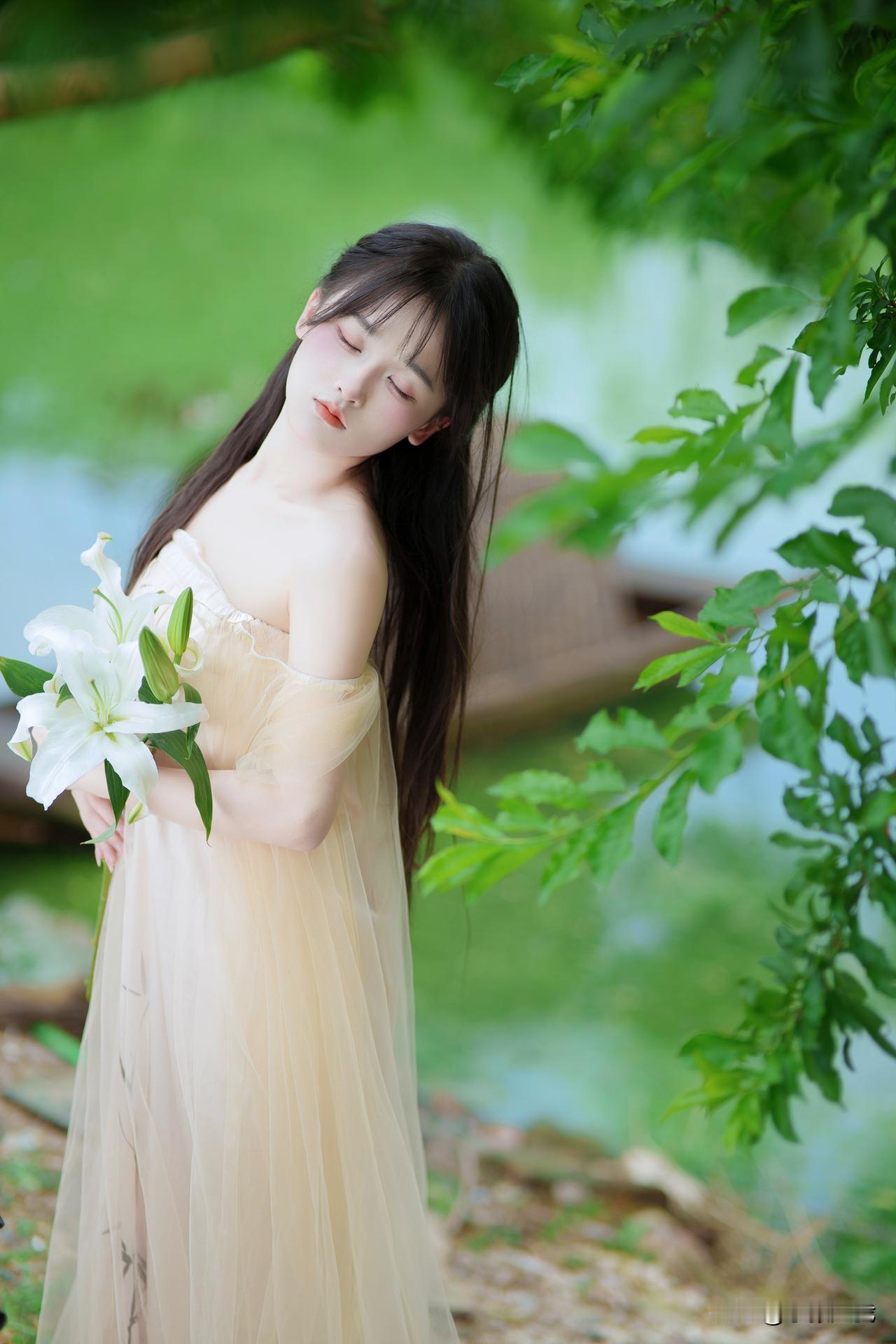 绿意悄然漫上肩头, 薄纱裙角轻触着光影。 白百合半开着花瓣, 将清浅的芬芳揉进风中。 指尖轻拂叶尖, 发梢垂落之际, 连呼吸都舒缓成了轻柔的曲调。 无需追逐光斑前行, 停驻于此便足矣——花是静谧的, 裙是柔美的, 眼底的盈盈波光, 与身后的潋滟水色, 皆裹着恰到好处的温柔。户外写真
