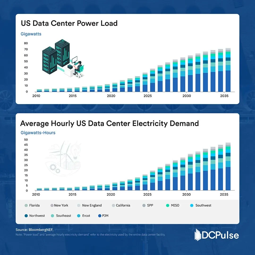 到 2035 年,数据中心的总功率负载较 2010 年几乎上涨十倍以上,多条地区曲线呈现持续“抬升”,说明全国范围的耗电需求全面进入结构性增长。