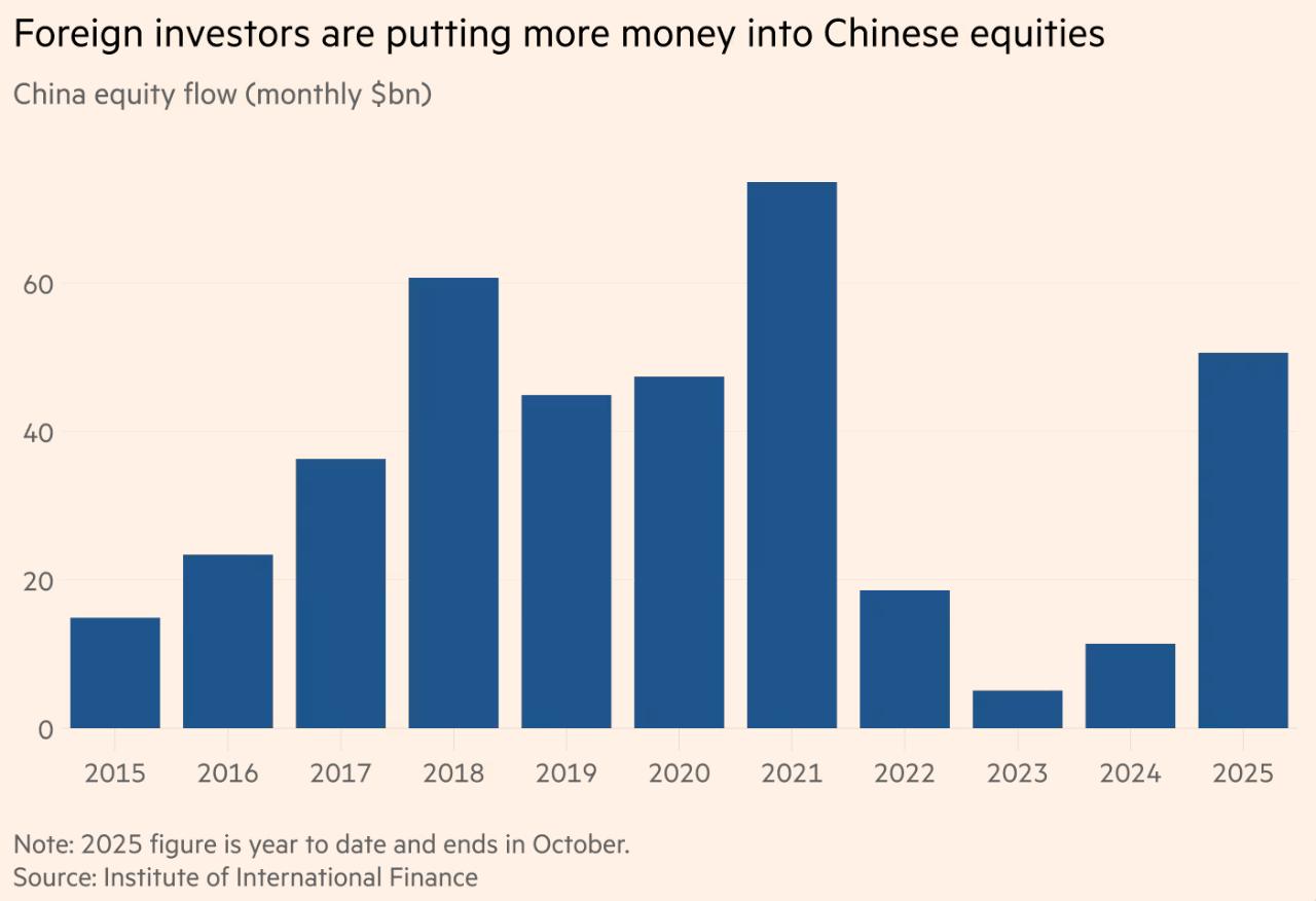 外资今年大举回流中国股市,规模创四年来新高,显示原本被不少海外机构视为“无法投资”的市场正在被重新评估。国际金融协会数据显示,今年1月至10月,外国投资者净买入中国股票达506亿美元,远高于2024年的114亿美元。受DeepSeek人工智能模型突破及香港新股市场回暖带动,中国内地与香港上市公司股价明显反弹。尽管外资规模仍未触及2021年创下的736亿美元纪录,但已扭转过去几年持续撤出的趋势。投资者表示,中国科技龙头估值仍远低于全球可比公司,吸引寻求分散风险的海外资金。与此同时,外资主动管理基金仍偏谨慎,但被动资金与内地散户蜂拥入市,使涨势主要由本地资金推动。今年大陆资金南下港股规模达1.3万亿港元,占港交所成交约两成。此前房地产下行、监管整顿与中美紧张曾重挫市场情绪,但近期监管机构推动一系列改革提振信心。尽管美国多州养老基金因地缘政治因素撤资,部分全球投资者仍将中国科技行业视为少数能与美国竞争的领域。 图片来源于网络