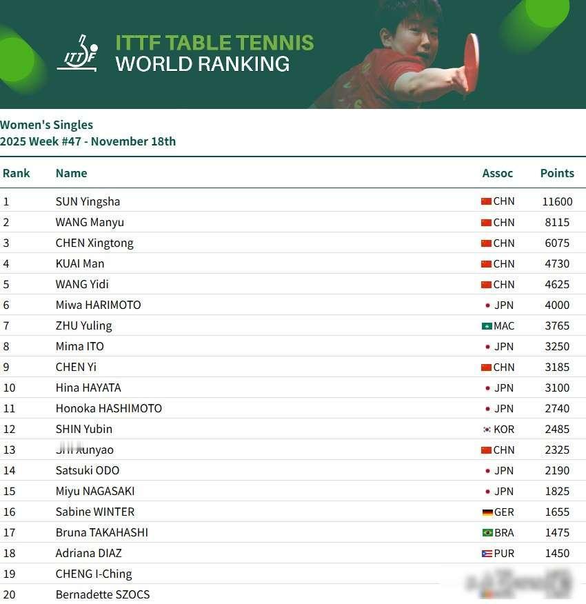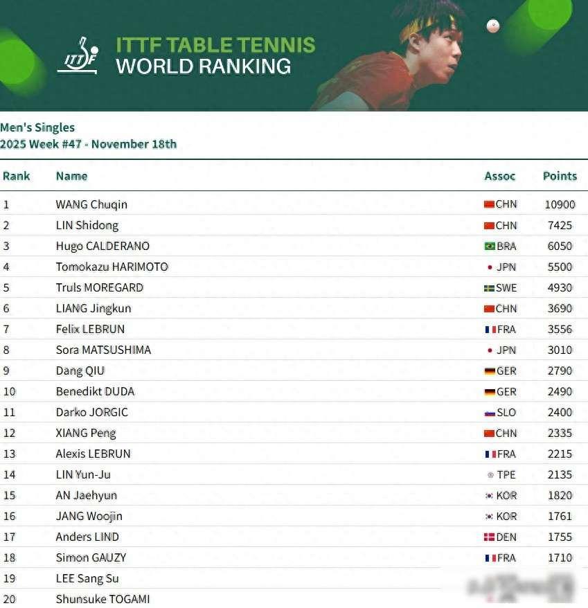 无悬念!2025国际乒联第47周排名:王楚钦孙颖莎稳居第一 2025年11月18日,国际乒联公布了最新世界排名,中国选手在单打和双打项目里依然占着多数位置,男单王楚钦以一万零九百分排第一,林诗栋差一点落在第二,梁靖崑第六,向鹏第十二,女单前五全是中国人的,孙颖莎一万一千六百分领先,王曼昱、陈幸同、蒯曼、王艺迪跟在后头,陈熠排第九。 双打项目里,年轻组合表现不错,男双王楚钦和林诗栋排第四,黄友政和林诗栋排第十,女双王曼昱和蒯曼冲到第一,孙颖莎和王曼昱排第四,蒯曼和王艺迪也进了前十,混双最突出,林诗栋和蒯曼直接登顶,王楚钦和孙颖莎紧追在后排第三,黄友政和陈熠排第十一。 从这份榜单看,中国乒乓的年轻选手正慢慢冒头,林诗栋和蒯曼在好几个项目里都挤进了前头,一边打单打一边兼双打,让人想知道他们能不能一直撑住,老将比如孙颖莎、王曼昱还是稳,但年轻队员一个接一个往上冲,压力已经悄悄来了。