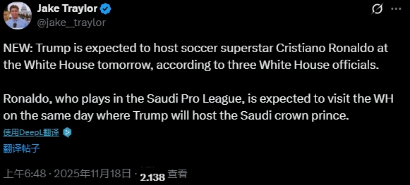 根据白宫记者杰克·泰勒消息,美国总统特朗普将在白宫接待葡萄牙球星C罗。杰克·泰勒:根据三位白宫官员消息,特朗普预计将于明天在白宫接待足球巨星C罗,还将接待沙特王储。C罗目前效力于沙特联赛的利雅得胜利队,他的访问与沙特王储穆罕默德・本・萨勒曼的正式访问安排在同一天。
