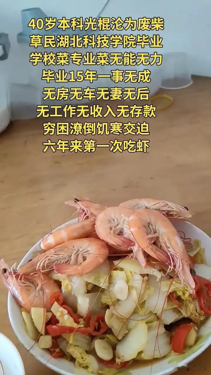 #MCN双量进阶计划#这问题出自哪里呢?网友发文倾诉,40岁本科光棍沦为废材,学校菜,专业菜,无能为力,毕业15年一事无成,穷困潦倒饥寒交迫,六年来第一次吃虾。 客观的说,如果属实,还是挺同情这位网友的遭遇,本科毕业,万万没想到会沦落到如今的地步。但从另一个角度来说,把这原因怨到学校就不对了,学校菜专业菜,为什么人家没有沦落到这个地步,而唯独你沦落成这样,不应该思考一下自己的原因吗?#寻美三湘# #长沙新朋友#