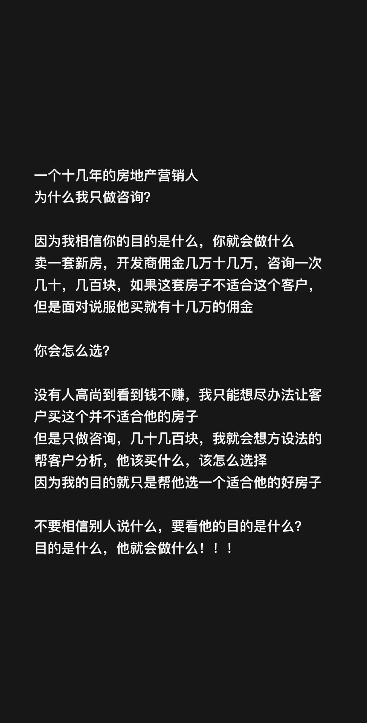 一个十几年的房地产营销人为什么我只做咨询?因为我相信你的目的是什么,你就会做什么卖一套新房,开发商佣金几万十几万,咨询一次几十,几百块,如果这套房子不适合这个客户,但是面对说服他买就有十几万的佣金你会怎么选?没有人高尚到看到钱不赚,我只能想尽办法让客户买这个并不适合他的房子但是只做咨询,几十几百块,我就会想方设法的帮客户分析,他该买什么,该怎么选择因为我的目的就只是帮他选一个适合他的好房子不要相信别人说什么,要看他的目的是什么?目的是什么,他就会做什么!!!