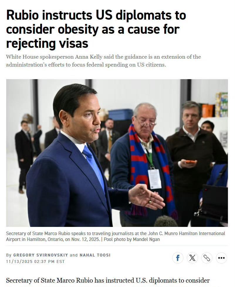 就在刚刚 美国突然宣布了 美国政坛突然丢下一枚“炸弹”:凡是患有肥胖或慢性病的外国人,在申请签证时可能直接遭拒。 不是因为安全问题,也不是因为犯罪记录,而是因为他们“可能成为公共负担”,这事一出,瞬间引爆全球舆论场。 到底是为了节省开支,还是变相歧视?美国这波操作,怎么看怎么别扭。 这事并不是空穴来风,根据美国《政治》新闻网披露,签证官需要评估申请人是否患有肥胖、高血压、糖尿病、癌症等慢性疾病,因为这些情况可能意味着“高昂的长期医疗支出”,会对美国纳税人构成“潜在负担”。 换句话说,美国想利用这条新规,把“未来可能花医保钱”的人直接挡在门外。 而这一政策的“理论依据”,则来自美国疾病控制与预防中心的数据:肥胖人群在医疗资源上的消耗更高,患慢性病的概率也更大。 听上去似乎有点道理,但问题是美国自己就不是“轻盈”的国家,美国成人肥胖率已经超过42%,也就是说,自己家还没减肥成功,先要对外人动刀?这逻辑,不禁让人皱眉。 把健康问题变成签证门槛,听起来像是在“筛选优质移民”,但动作一大,立刻踩进了歧视的雷区。 首先,美国签证系统本就存在不透明和主观性强的问题,而这项新规赋予签证官更大的自由裁量权。 可问题是,他们并不是医生,也没有设备能真正判断一个人是否健康,很多时候,只能靠“目测”来判断申请人是否肥胖,一个人站在窗口,肤色、体型、气质,很可能就决定了签证的命运。 再说,肥胖并不总等于不健康,很多人虽然BMI超过标准,但工作能力强、经济条件好、完全不依赖公共资源。 可在这套逻辑里,他们就因为“看起来胖”,被一刀切掉,这不是“风险评估”,而是赤裸裸的标签化。 更讽刺的是,美国不少知名政客、演艺明星,自己也属于“肥胖人群”,如果按这套标准,他们自己恐怕也很难拿到签证。 表面上看,这项政策是为了“节省联邦医疗支出”,把有限的资源留给美国公民,但深一层来看,它其实是特朗普政府“限制移民”路线的延续。 从2017年起,美国就不断收紧移民政策,强调“美国优先”,这次把焦点对准健康问题,目标依旧没变,把“可能花钱的移民”挡在外面。 白宫发言人也不避讳,直接表示这是为了“让美国人优先享受联邦资源”,但问题是,真正造成美国医疗系统高负担的,是结构性问题,高药价、保险制度不平等等,而不是几个外国签证申请人。 想靠拒签“胖人”来缓解医保压力,无异于头疼医脚,说得难听点,这更像是甩锅:把国内失败的健康政策和社会问题,丢给外国人背锅。 这项政策可不只是关乎旅游签证,它适用于包括H1B在内的多种非移民签证,也就是说,哪怕是拿着高学历、技术过硬,准备去硅谷工作的工程师,如果被判定为“健康风险”,也可能被拒。 这对美国来说是双输,世界各国都在抢人才,而美国的优势正是它对人才的包容和吸引力。如果现在连健康都成了门槛,那些本来愿意来美国深造、工作的优秀人才,可能会选择别的国家。 更别说,那些即将出国留学的学生、准备团聚的家庭,这一刀切的政策,影响的是无数普通人的命运。一个“看似合理”的健康标准,变成了阻断人生规划的墙。 这不是美国第一次在移民政策上“动手术”。从特朗普上任开始,“公共负担”这个词就频繁出现在政策文件中。 从限制低收入移民,到现在把慢性病也算进来,美国政府眼中的“理想移民”越来越像是“零负担、零风险、零瑕疵”的完美人设。 但真实世界不存在完人。任何人都有可能生病、有衰老、有需要帮助的时候。如果一个国家的移民政策,建立在对“完美身体”的幻想上,那它终究会脱离现实。 更关键的是,美国社会内部的不平等和公共资源压力,是几十年积累下来的结构性问题。 用一个签证新规来“解决”,怎么看都像是政策偷懒,甚至是一种政治表演:用“我们管得住移民”来安抚选民焦虑,用“这些人会花你们的钱”来煽动情绪。 以健康为借口拒人于门外,不仅不科学,也不体面,美国如果真想管好医疗资源,就该从内部医改入手,而不是把责任推给外人。 让签证官靠目测判断谁可能生病,这种“拍脑袋”的政策,终究留不住人,也留不住信任。 世界在变,人才流动早已没有国界,一个国家的强大,从来不是建在拒绝上,而是建立在开放、包容和制度自信之上。美国想走哪条路,时间会给答案。 信息来源:美媒曝光:美国将拒绝肥胖外国人入境——光明网