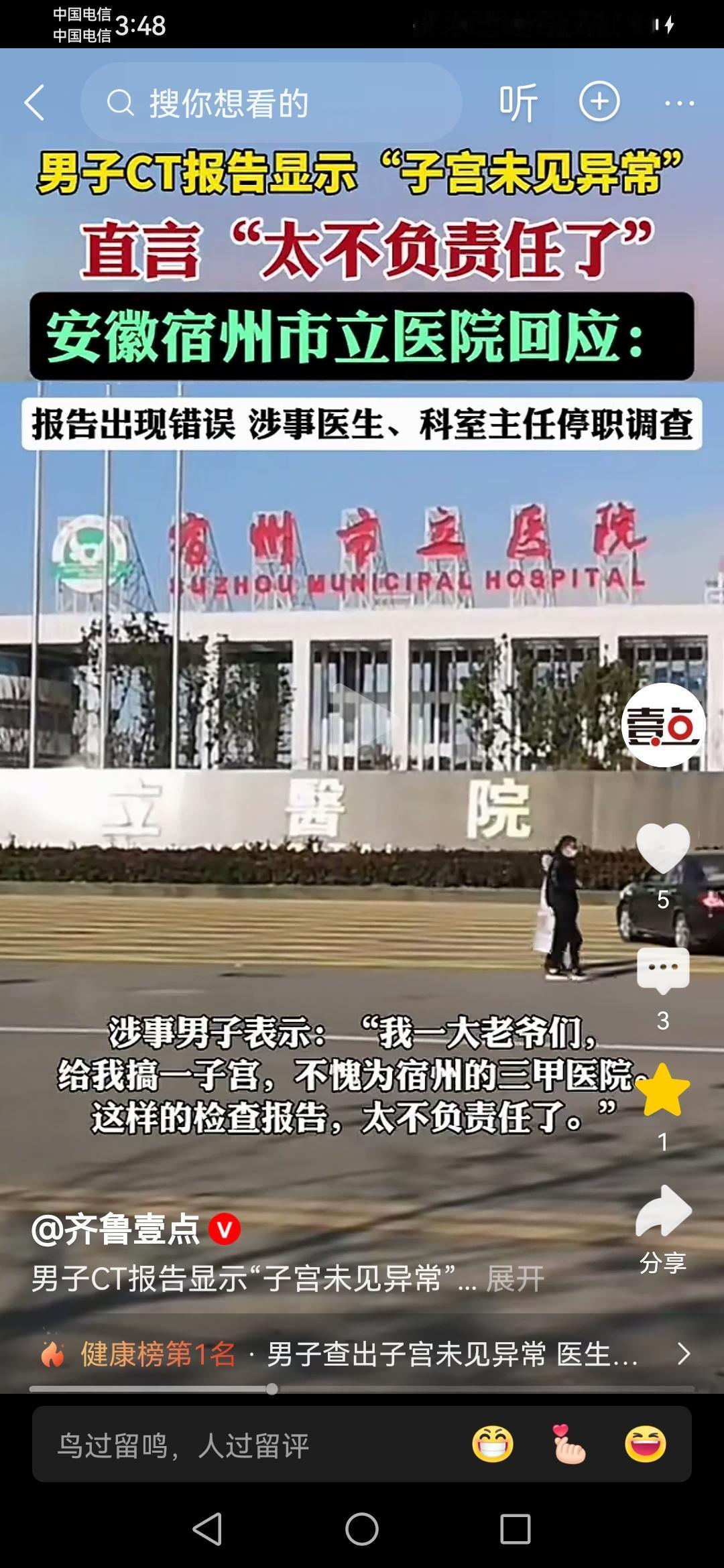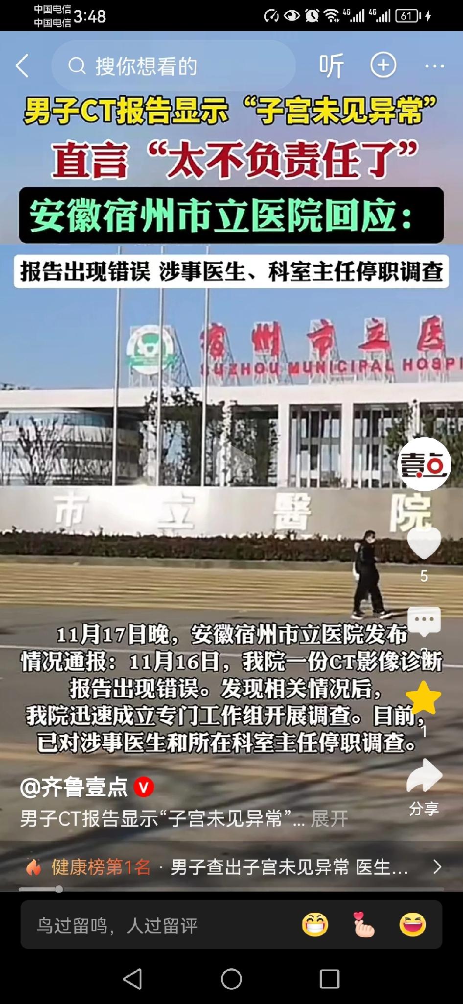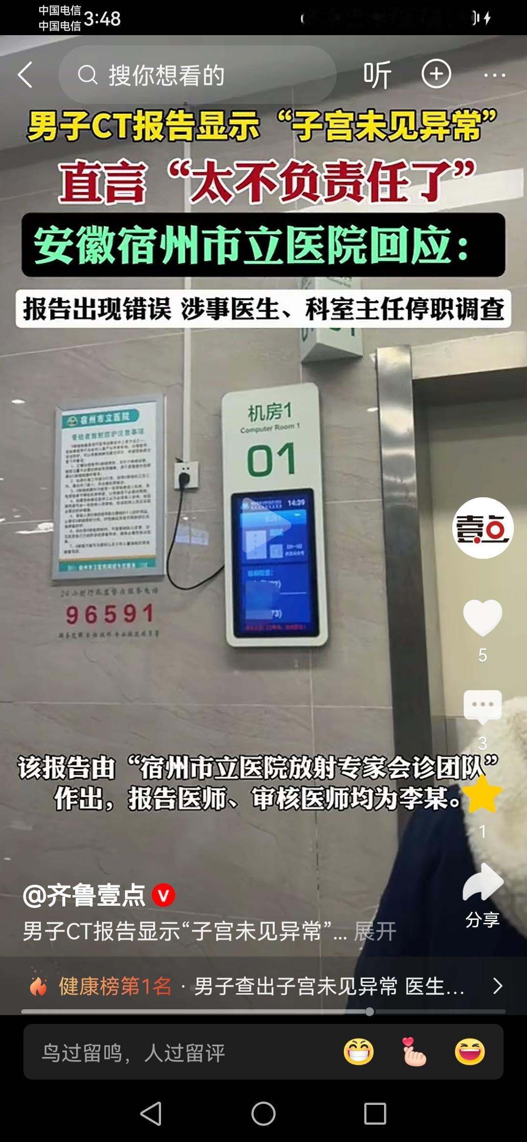 男性的CT报告里面, 显示“子宫未见异常”!!! 这不是医生专不专业的问题,而是一起典型的“大乌龙”人为事件! 本来以为是一则搞笑段子,想不到竟然现实真的就这么发生了。 事情就发生在安徽宿州当地的一家医院,事情发生以后,负责CT检测还有出报告的相关工作人员已经被暂时停职处理。 男子看到自己的CT报告里面出现女性才会有的相关疾病报告,表示自己心里有点难受啊!