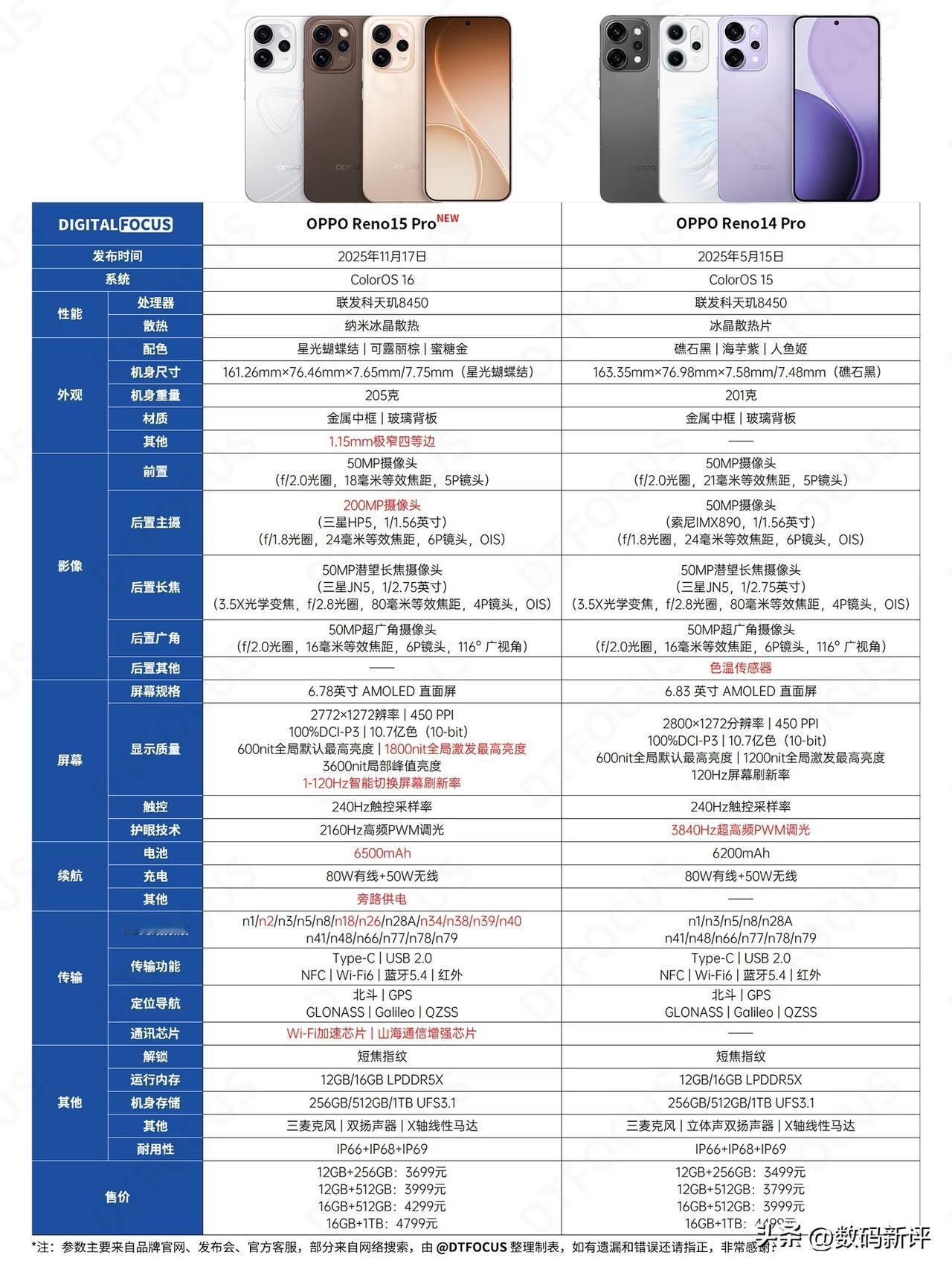 OPPOReno15Pro对比14Pro[思考]处理器还是天玑8450,下一代Reno16系列是不是要升级大一点啊,诚意得多一点呐[我想静静]哪怕天玑次旗舰芯也行啊,升级了主摄/频段/电池容量,窄边框,涨价200,大内存版本涨价300!所以还是上一代14Pro会更好[灵光一闪]