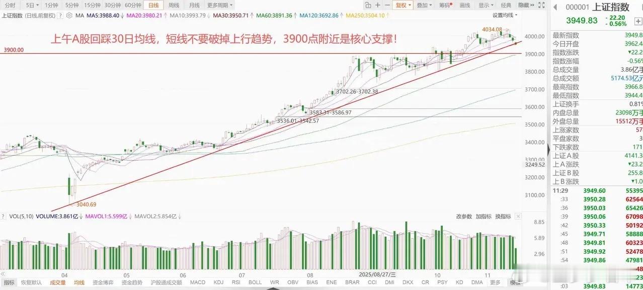 美股下跌引发全球股市跳水,日韩股市午间跌幅超3%!A股科技股反而逆势走强,能扛住下跌风暴吗? 1、美股昨夜再度跳水 4月份以来,美股科技股不断上涨,带动美股大盘走强。但是从10月29日,代表美股科技股走势的纳斯达克指数创了历史新高24019点以后,开始掉头向下走弱,最近2-3周,美股科技股都是偏弱的下跌盘整行情。昨天三大指数又跳水了,道指跌1.18%、纳指跌0.84%、标普500指数跌0.92%。 2、高位科技股带动全球股市普跌! 美股下跌的原因,来自于投资者们对于疯狂上涨的科技股,估值过高的担忧。全球AI龙头自从被软银清仓以后,三季度被桥水基金减仓近7成,昨夜传出再度被知名投资机构清仓。昨夜科技股普遍下跌,且市场认为美联储在12月再度降息的概率已经不足一半了,带动全球股市普跌! 3、亚太股市跳水,日韩股市跌超3%! 美股跳水引发欧洲股市全线跳水,今天亚太股市同样遭遇开盘跳水,上午不仅没有呈现出跌幅收窄的迹象,反而跌幅继续向下扩大,北京时间午间12点半,日韩股市跌幅都扩大到3%以上了。昨夜中概股同步走弱,纳斯达克中国金龙下跌1.21%;今天的港股恒生指数跳空低开0.8%以后,午间跌幅扩大到1.5%。 4、A股涨跌分化,科创50指数逆势上涨0.93%! 在全球股市大跌的背景之下,今天A股的走势还算比较克制,上午A50期指居然还翻红了,可惜午间受日韩股市不断跳水的影响,再度翻绿。截止午间收盘,A股出现涨跌分化,上证指数下跌0.56%,收在3949点,深证成指和创业板指同步下跌0.43%,科创50指数受半导体板块上涨的影响,反而逆势走强,午间涨幅达0.93%! 5、科技股反而走强了! 全球科技股目前风声鹤唳,都在担心高位见顶的风险,A股科技反而逆势走强了!上午涨幅榜前四的板块分别是互联网、软件服务、半导体和广告包装板块,涨幅依次为2.32%、1.59%、1.57%、1.39%。软件服务和广告包装近期在股评中有重点提醒,走势策略可复盘昨日收评,属于科技类相对低位赛道,高低切换的方向之一。 综上所述,今天上午上证指数回踩30日均线和短线支撑位,只要守住这个位置不破,不能继续向下走,那大盘就还在短线的上行趋势之内。反过来,如果3900点附近的关键支撑带破位,大盘就要进行减仓风控了。 密切关注下午的行情走势,A股午间收盘以后,亚太股市仍然在不断跳水的过程中,大概率会给A股午后行情造成利空影响,大家一定要小心谨慎!但是今天科技股的走强,也给市场带来了一定的信心和希望,希望能扛住下午的风暴吧!