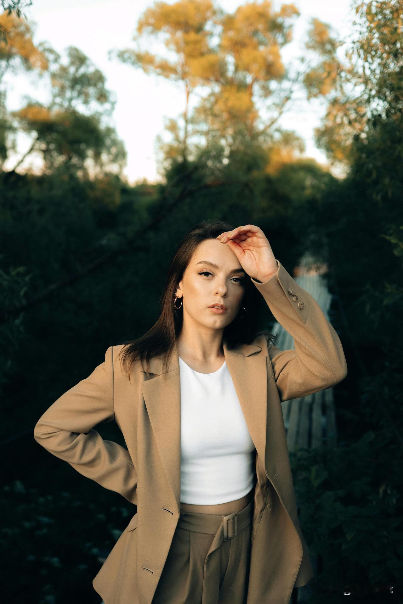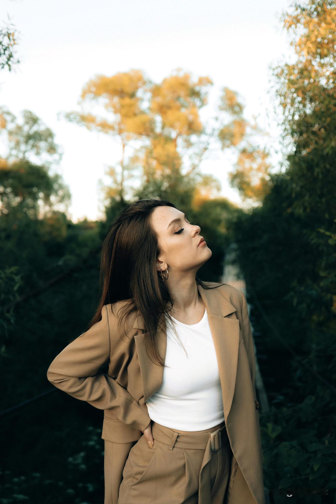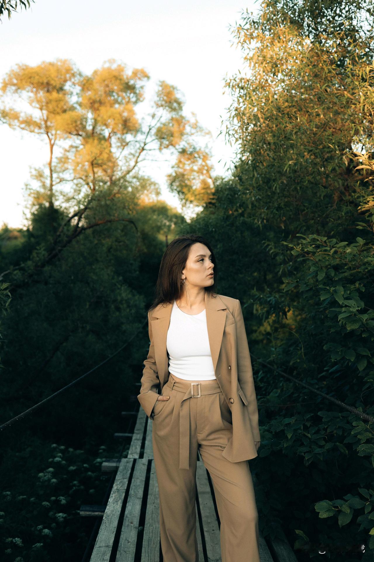 卡其色西装裹着气质美女松弛的气场,白衫露的腰线是温柔的破绽。指尖掠过额发时,耳圈晃着细碎的光,连风都裹着树影的暖意。 她站在木桥的光影里,手插兜的姿态有点漫不经心,垂眸时发梢蹭过她肩线——是利落里掺了点柔软,又像是把秋阳揉进了西装的褶皱。卡其色穿搭 卡其色风衣穿搭