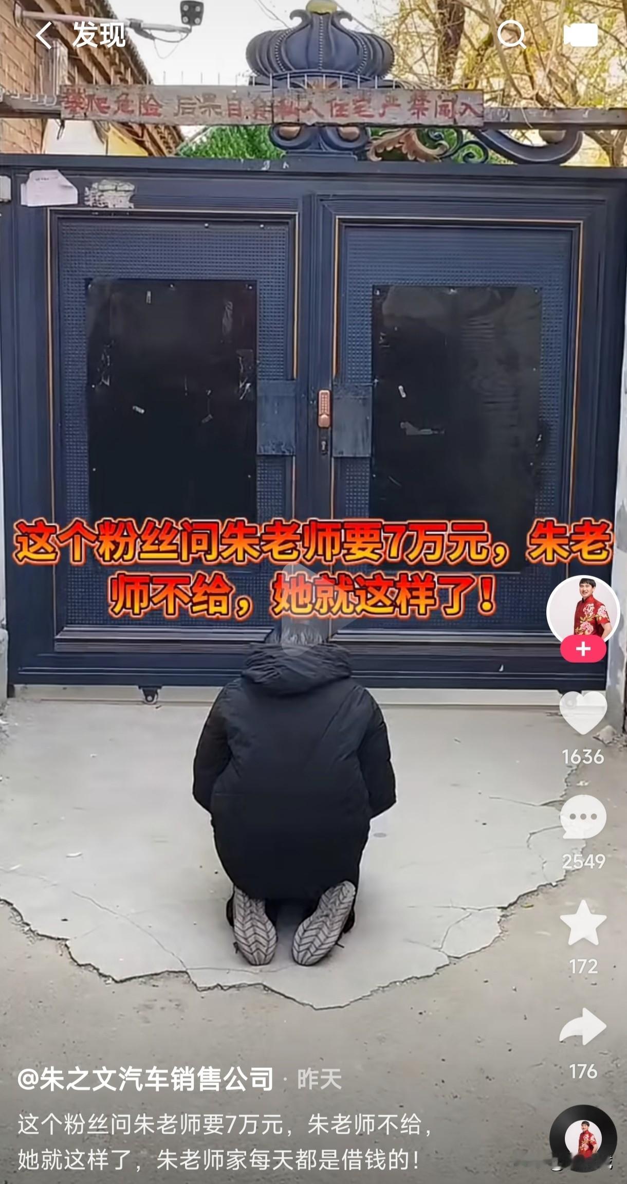 人出名后各路妖魔鬼怪都现身了。 朱之文粉丝问他要7万块钱,他不给,这位粉丝就一直在他家门前跪着,这究竟是借钱的?还是乞讨的? 为什么看不到其他名人门前有人跪着要钱的,反而朱之文家门前跪着要钱的人接二连三的?这究竟是什么原因呢?是因为他一直在农村生活?人人都知道他的家庭住址吗?或者是他这个人比较好相处,没有什么大架子,在邻里之间的口碑较好,在他跟前借钱更容易借到? 不知道这些人跪在人家家门口借钱的方式真的对吗?对一个素不相识的陌生人谁愿意借钱给她,这个钱借出去会还回来吗?有手有脚的去自己挣不好吗?为什么宁愿不要脸面也要跪在人家家门口借钱?这样的做法究竟是何居心?
