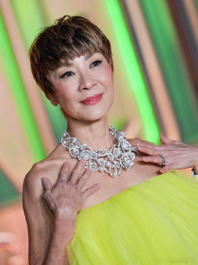 杨紫琼棕色超短发利落又时髦,荧光黄蓬蓬裙亮眼到发光,颈间珠宝blingbling的,侧身露背那下线条好看得让人移不开眼
