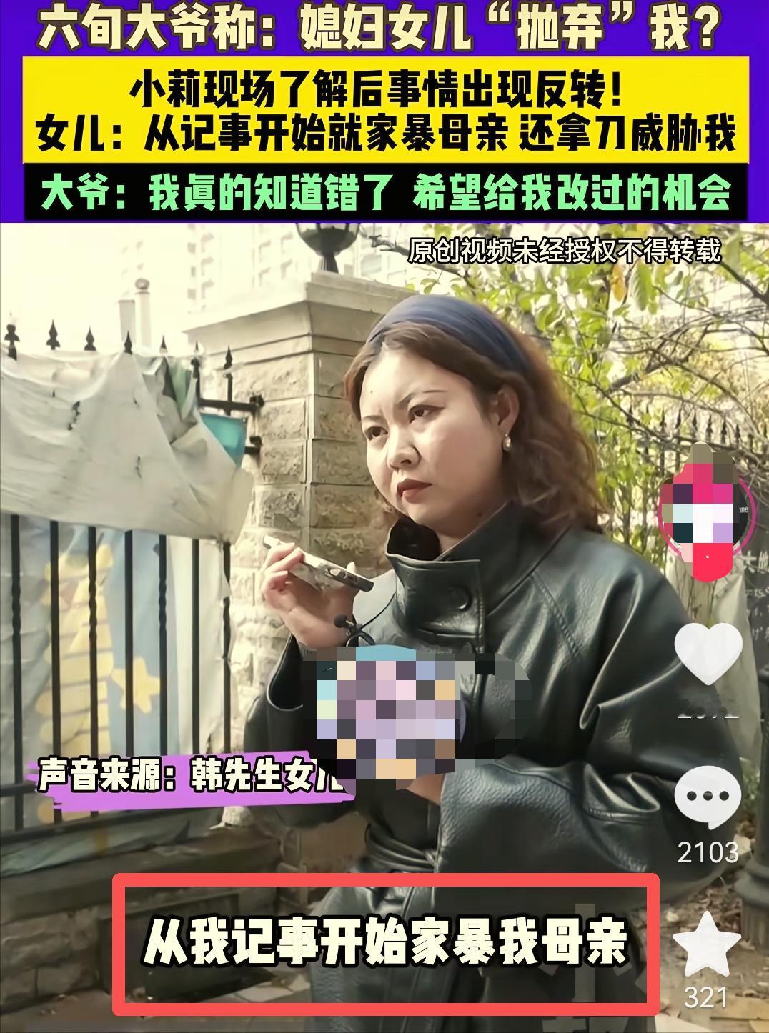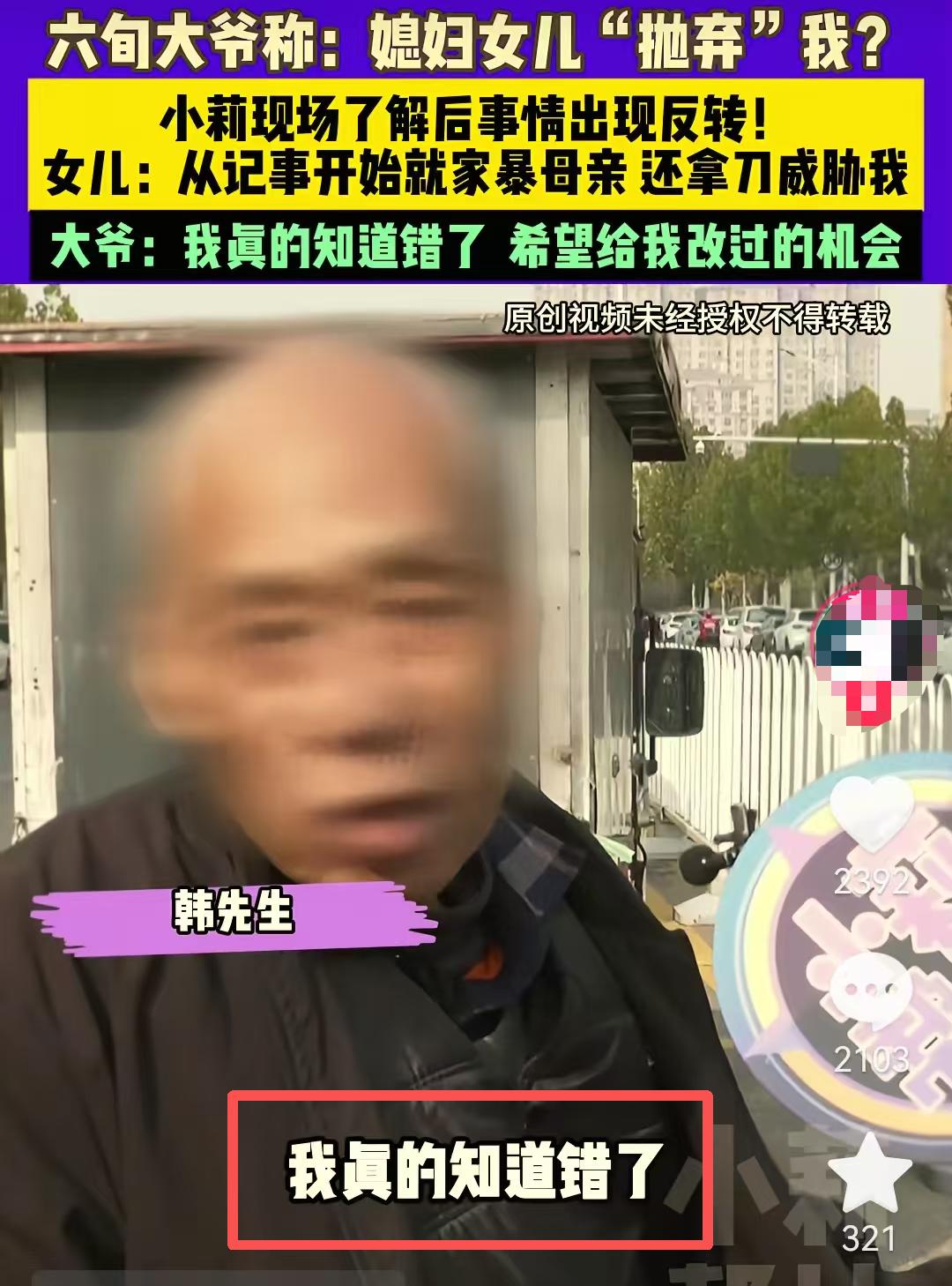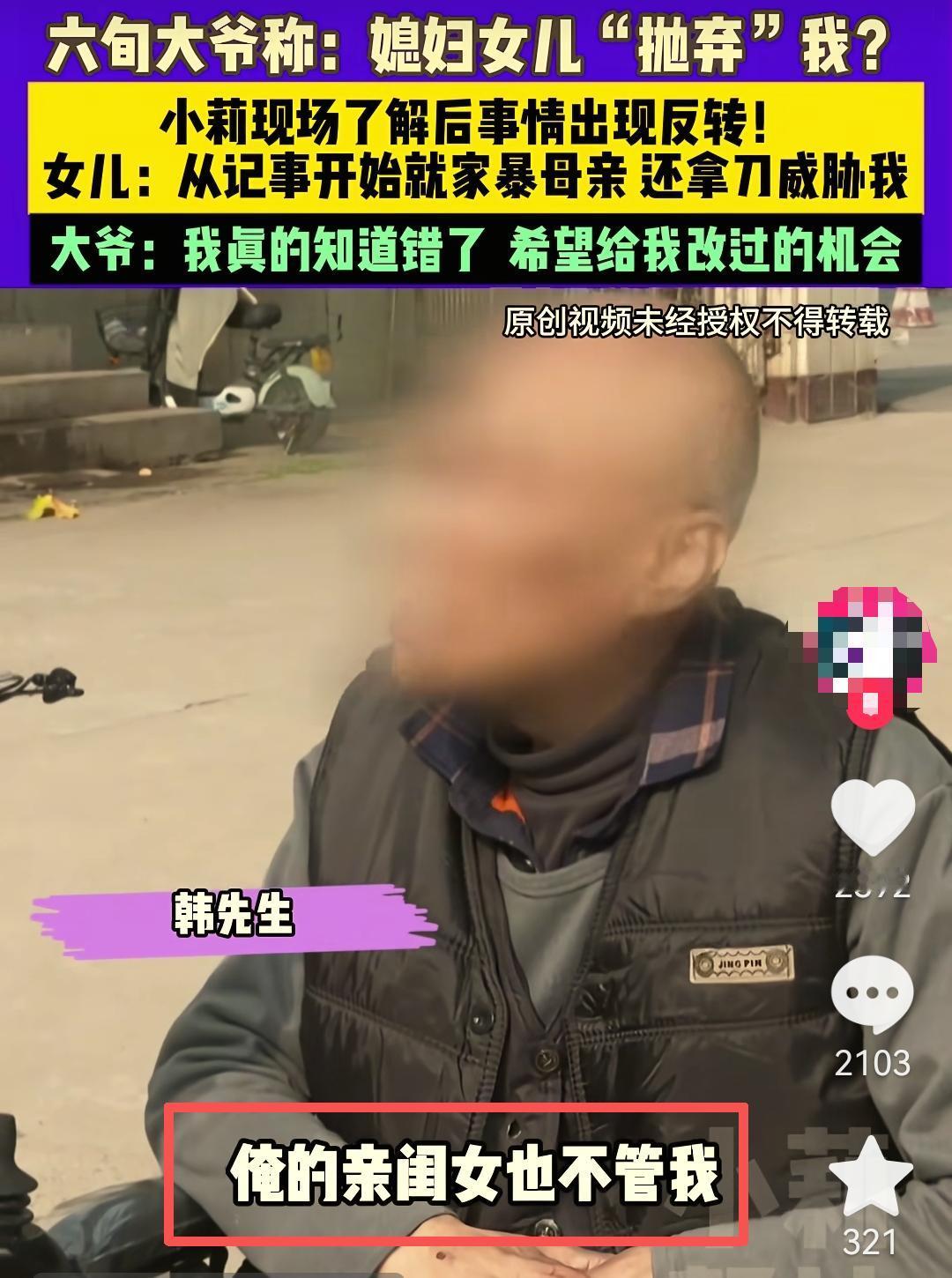 72岁的韩大爷,坐着轮椅,对40年前犯下的错,给妻子道了歉。 年轻时候的韩大爷是位猛人,不是在外面有多能闯,而是典型的窝里横。 他能每天都喝到酩酊大醉,隔三差五就找借口打老婆一顿,而且次次都是下的狠手。 有一次,老婆实在忍不了他酒后胡言乱语,就回了一句,他抄起瓶子就往老婆头上砸。 这一切都被女儿小韩看得一清二楚。 小韩说,有一次,父亲照旧喝得醉醺醺的,拿着刀在妻女面前耀武扬威。对着年幼的女儿说:我不仅要弄si你妈,还要先弄si你。 她从小成长的环境就是这样,整天抱着妈妈生活在恐惧当中。 一切随着她慢慢长大,她的处境慢慢好了些。但是,爸爸的脾气仍然不改,对着母亲张口就骂,抬手就打。 老天终是看不过去了。2020年,韩大爷得了脑梗,腿脚都不利索了,出手打人的行为少了许多。 母女俩念着他这么多年以来一直是家庭里的一员,尽心尽力伺候他,想让他尽快康复。 万万没想到的是,即使坐在轮椅上,去年4月份仍将老婆骂到狗血淋头,什么狠话恶话都往外撂。 女儿小韩实在忍不了了,劝母亲同意,两人将他送进了敬老院。 老韩此时才意识到家人的重要性,找来调解员从中说和,并流下了悔恨的泪水。 都说迟来的深情比草贱,像韩大爷这样的人,遭此报应就是天意。 年轻时有多猖狂,年老时下场就有多凄惨。 人做过的事,走过的路,每一样,每一步都算数,老天都给你记着账呢! 不是不报,时辰未到。时辰一到,全部得报。 家庭暴力伤人深,悔悟迟到难弥补。尊重与善待亲人,才是全家真正的幸福之路。 奉劝那些有家暴行为的人,尽早住手,迷途知返。