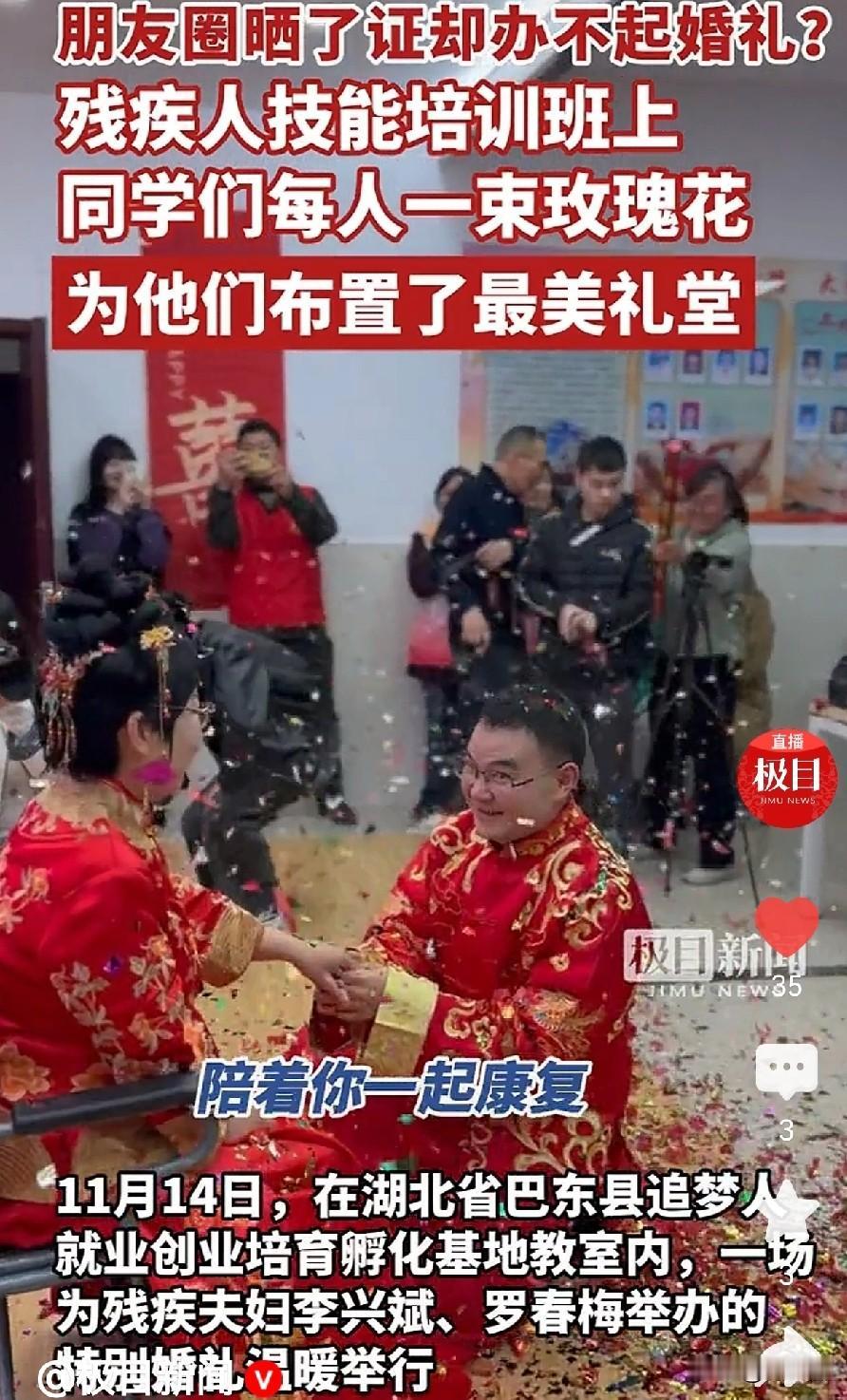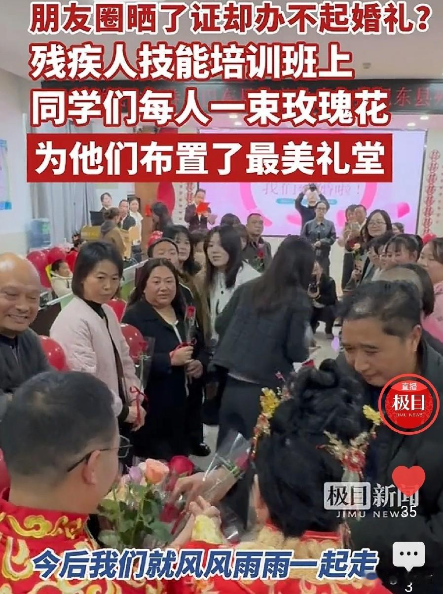 迟早要哭死在互联网上,近日湖北省巴东县,两个残疾人在朋友圈晒出,领了结婚证,却办不起婚礼。 他们两个,一个视力模糊接近失明,一个右半身瘫痪,在“追梦人培训孵化基地”,一个残疾人技能培训班上,两个人从相知相爱走到了一起。 没有惊天动地的邂逅,就是两个同样在生活里挣扎的人,看到了彼此身上的坚韧和温柔,慢慢从相知走到相爱,最后下定决心要一辈子相伴。 当老师,同学知道了他们的情况,由当地的残联和妇联,为他们精心准备了一场属于他们的婚礼现场。 45个同学,每人一朵玫瑰花,带着红气球和来自每个人由衷的祝福,为他们点缀了一场,充满爱的最美礼堂。 他们都是生活里的普通人,甚至要比常人多付出几倍的努力才能站稳脚跟,可他们没有被磨难磨去善意,反而把彼此的温暖聚在一起,帮一对新人圆了婚礼梦。 有时候真觉得,互联网让人哭的不是悲伤,而是这些猝不及防的温柔。两个残疾人的爱情,没有物质堆砌,却纯粹得让人动容。 一群陌生人的善意,没有惊天动地,却实实在在照亮了别人的生活。最好的婚礼,从来不是有多豪华,而是有多少人真心为你祝福,这才是互联网真正赋予的意义吧。 (图片来自网络视频)