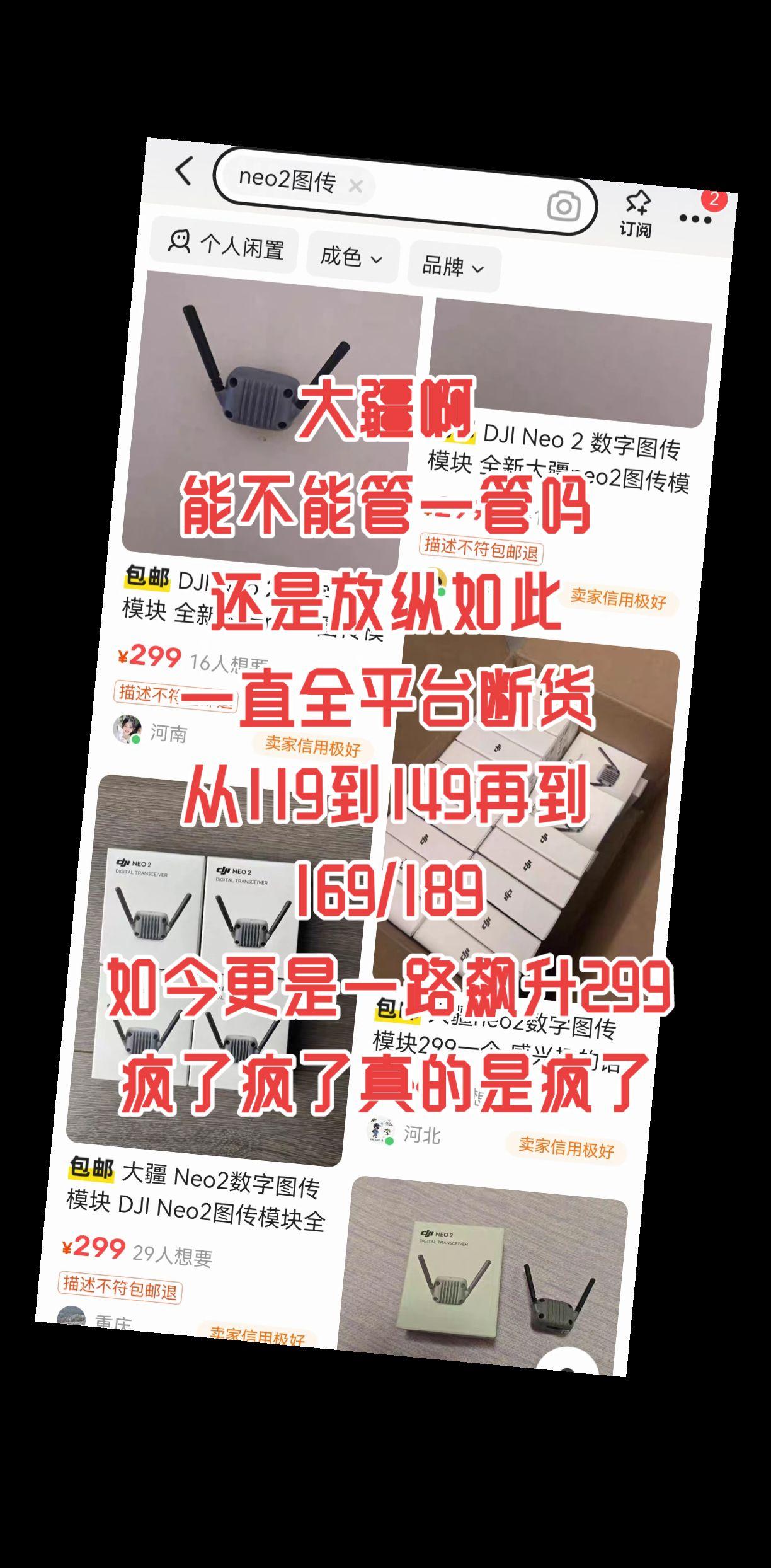 没有想到真是让人意外,整个neo2代系列最赚钱的居然不是机器,而是这一个小小的04图传配件,从官方的119,一路飙升到299。直接翻了二倍,黄牛手里的货可真多呀,各大平台旗舰店全部断货,他们手里却一直不缺货,让人匪夷所思。 有些网友说有的实体店会有货,但是寥寥无几,只是个别。其他地方想使用的网友首选还是网络平台,不然就是必须要购买套装产品。 日常分享 大疆Neo2