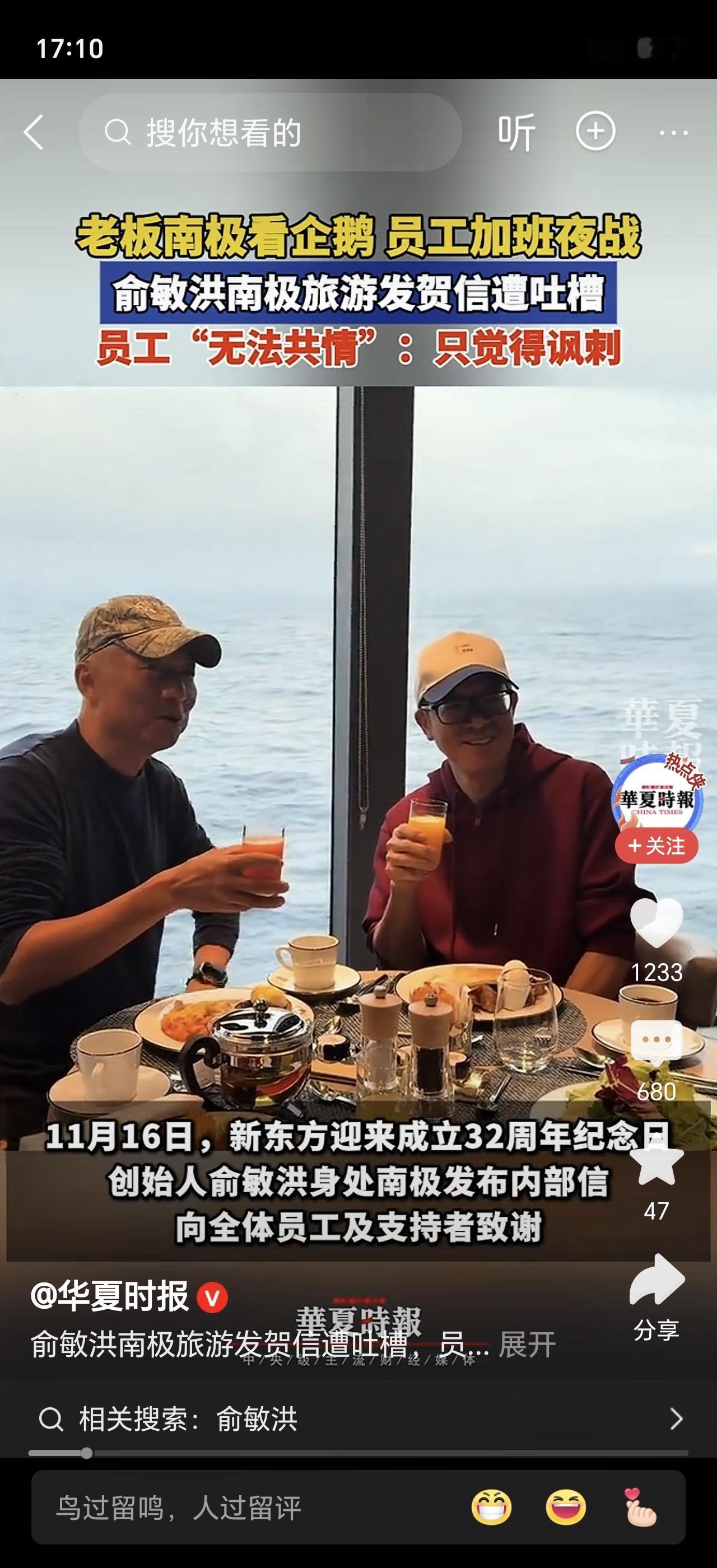 老板在南极看冰山聊企鹅抱团,员工在工位赶方案算KPI,这样的“鸡汤”谁能共情?俞敏洪南极发全员信的争议,算是把企业家鸡汤和员工日常的鸿沟摆到了台面上。 这封满是诗意的信里,17次提“我”、5次说“南极”,却没提员工连夜赶的续费方案、通勤路上的疲惫。不是员工不认可坚守,而是脱离现实的口号,根本暖不了加班到深夜的人。当代年轻人要面对的是学历贬值、AI替代压力,比起“越冬哲学”,他们更在意薪资能不能跟上、下班能不能准时。 真正能凝聚人心的,从来不是远方的抒情。胖东来给员工放150多天带薪假,亏损老板照样给老员工发奖金,这些实打实的关怀,比一万句鸡汤都管用。 企业家的情怀没错,但鸡汤得落地到日常。少点自我感动的叙事,多点对员工需求的倾听;少点空洞的激励,多点薪资、减负、成长支持的实际行动。毕竟企业的寒冬,从来不是靠口号熬过的,而是靠员工心甘情愿的付出,而这份付出,永远需要双向奔赴的温暖。 俞敏洪 企鹅
