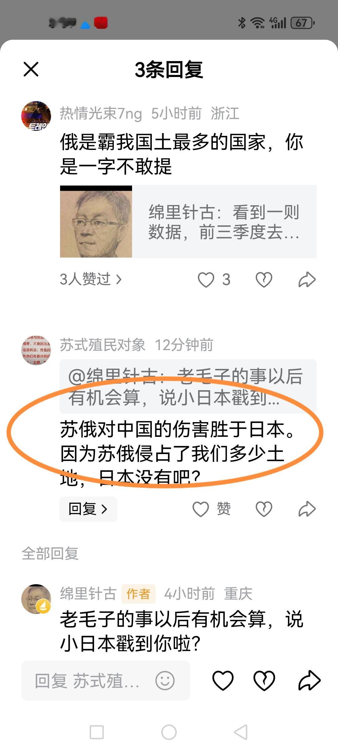 国家在和日本右翼势力斗争,我在和国内媚日精日者斗嘴,核心利益不容侵犯,民族气节不可丧失! 最近血压有点高,都是被那些评论区替军国主义洗白、为高市错误言论圆场、以及那些无知添腚的言论给气的。 诸如“亡国奴的与底层人的感受有多大区别?”、“苏俄对我们的伤害胜过日本”、“我们的外交官说话过头了”、“我去日本是自己的事想去哪就去哪”等等,相信大家也看到无数类似妄语。 我已经不想再呵斥这类人了,只想说他们最终只能成为两种人,一种是心甘情愿的汉奸、叛徒和走狗,另一类是永远跪在人家脚下的奴役。当失去了祖国的护佑,他们仍然与“华人与狗不得入内”时期的可怜虫无异,正所谓可怜之人必有可恨之处。