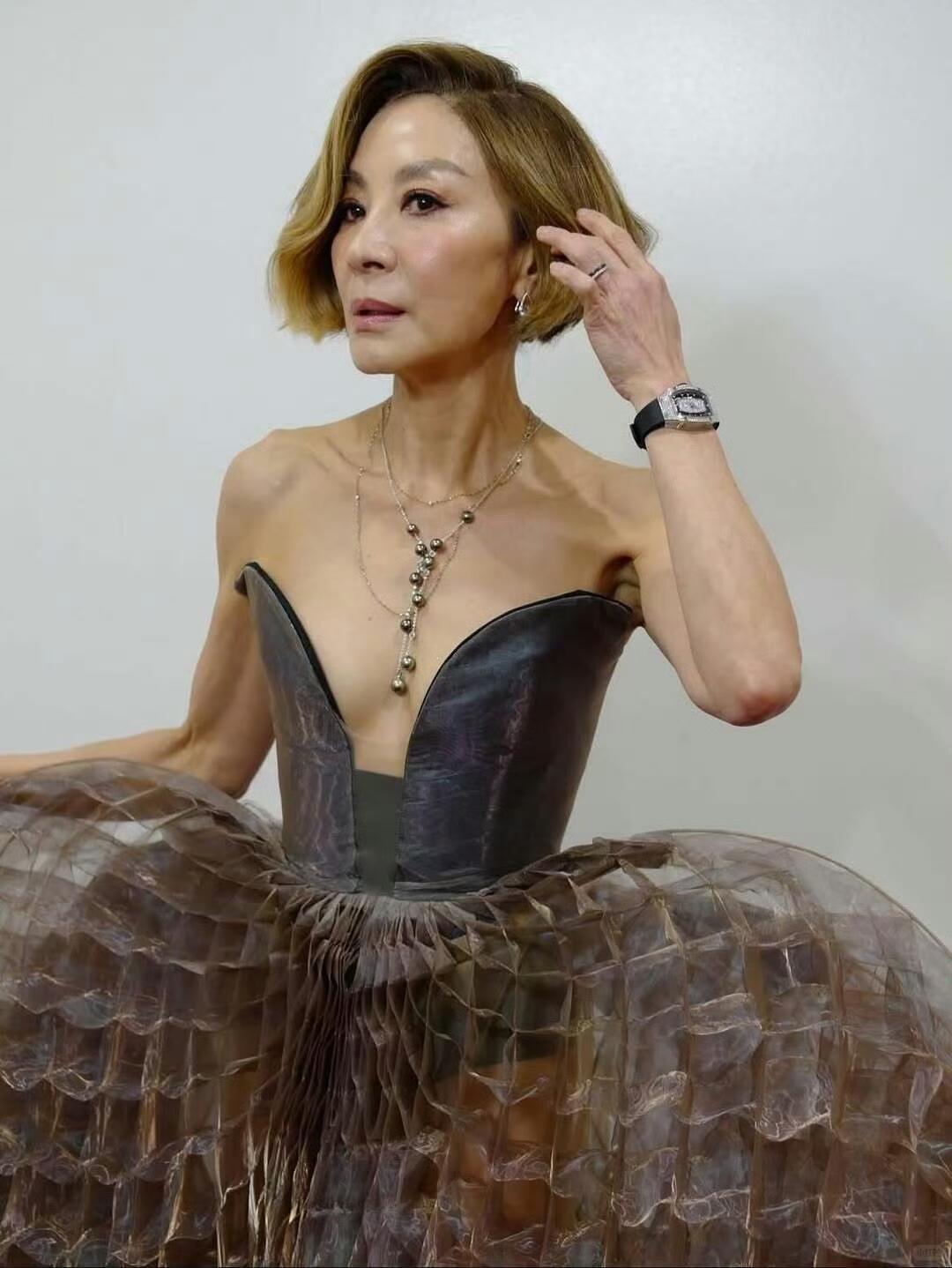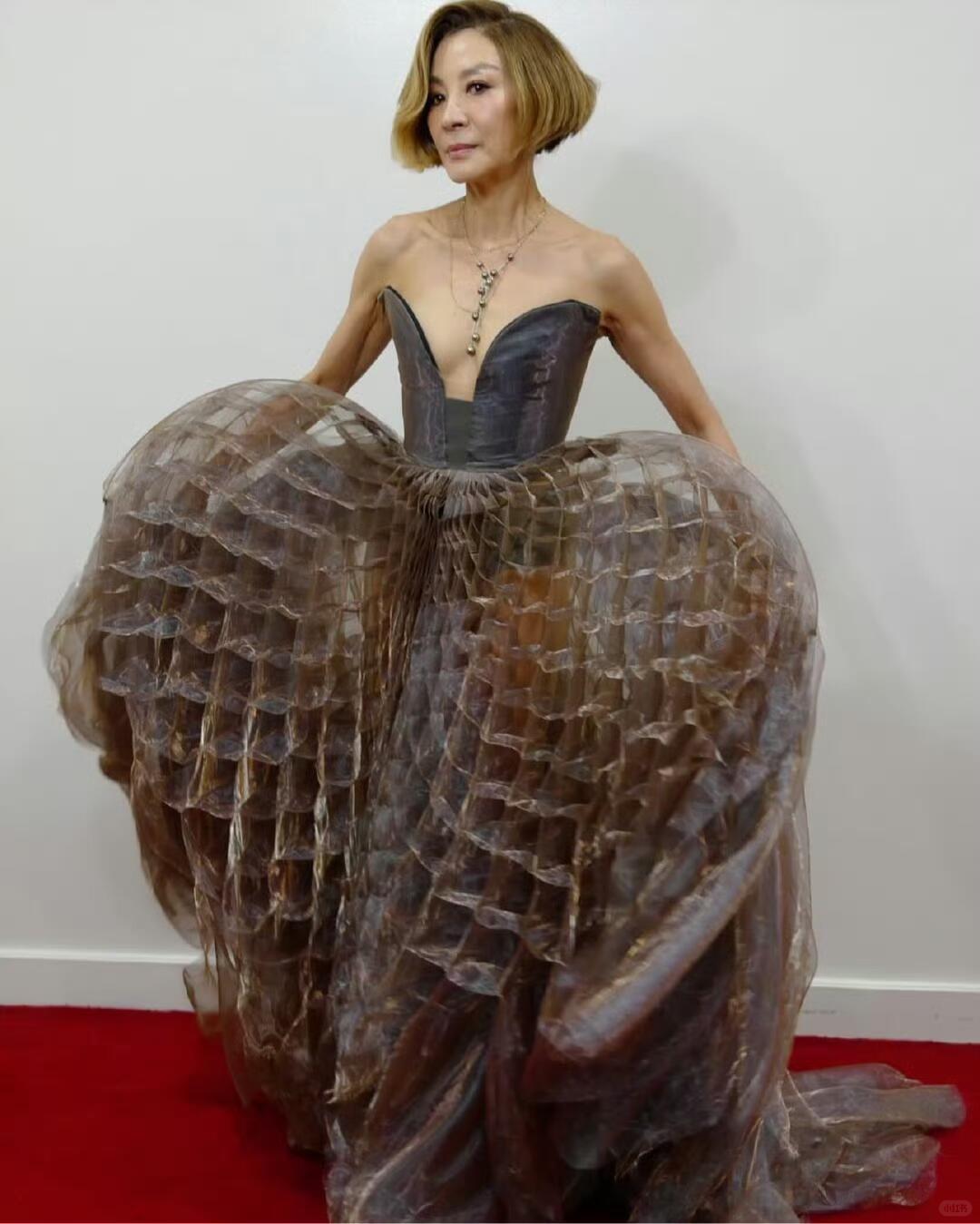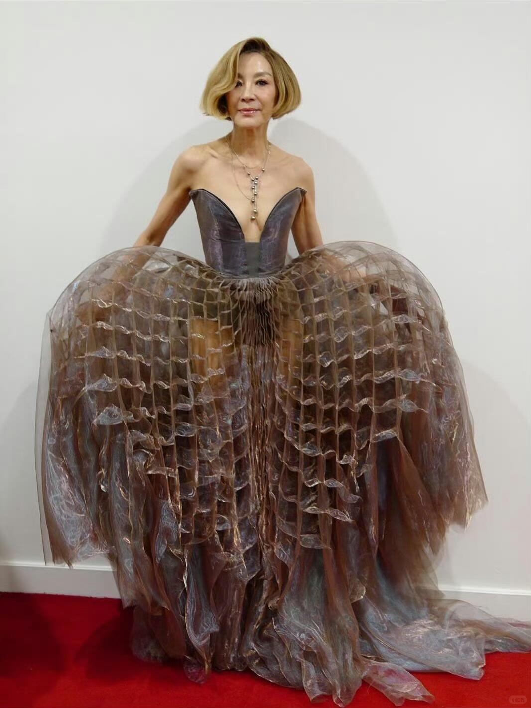11月13日,杨紫琼去新加坡参加《魔法坏女巫2》的亚太首映礼,一番话把国内网友哄得挺开心——“特别想念中国,很快就会回来”。毕竟她是马来西亚籍华人,祖籍福建,这份念家的劲儿确实戳人,不少人留言“等着姐姐回来”“华人情怀太暖了”。 但比起暖心表态,大家更关注她的状态和穿搭,争议直接拉满! 先说说身形,今年63岁的她,瘦得也太夸张了,简直瘦到脱相。当天穿的露肩礼服,把锁骨、胳膊都露出来了,看着就只剩一副骨头架子,脖子又细又长,上面的青筋都清清楚楚,松松垮垮的皮挂在身上,看着有点吓人。 脸也透着一股干瘪感,没多少肉,全是皱纹,尤其是一笑起来,法令纹深得像两条沟,都快延伸到下巴了。 再说说那身礼服,真的让人看不懂!下摆的设计怪得很,纹理皱皱巴巴的,被网友吐槽“像没刮鱼鳞的鱼皮”“看着像卤味店里的牛肚”,审美完全get不到。上身还搞了低胸真空设计,露出一大片,可她本身胸又小又平,不少网友直言:“这个年纪真没必要露这么多,看着挺突兀的”。 不过也有网友帮她说话:“穿衣自由不分年龄,奥斯卡影后想怎么穿就怎么穿”“可能艺人工作忙,保持身材不容易”。但更多人是真担心她的健康:“瘦成这样太吓人了,骨头都快支棱出来了,赶紧补补吧”“跟国内同龄艺人比,看着老太多,主要是瘦得没气色”。 说到底,网友的争议无非两点:一是觉得60多岁没必要这么瘦,健康最重要;二是觉得穿搭可以大胆,但也得贴合自身情况,露太多、设计太怪反而不好看。但话说回来,杨紫琼都拿过奥斯卡影后了,早就不靠外貌和穿搭博眼球,可能这就是她自己喜欢的状态和风格吧~