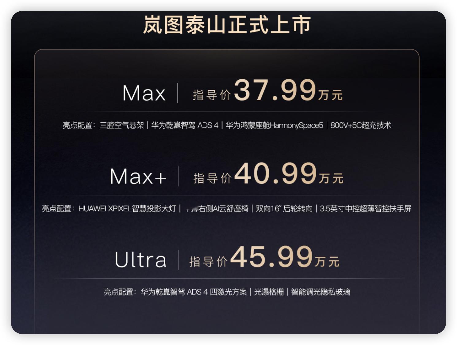 岚图泰山正式上市了,37.99万起售Max , 37.99 万Max+ , 40.99 万Ultra , 45.99 万