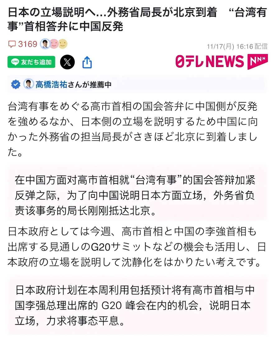 日媒:日方计划在G20峰会与中方会谈,平息事态。中方:不见!日本媒体先是报道称:日方计划在G20峰会上,利用与中方总理共同出席的机会,说明立场此前高市早苗言论的立场,以平息事态。没想到仅仅过去几十分钟,又有日媒报道称,中国外交部已表示在G20峰会上没有与高市早苗见面的计划……