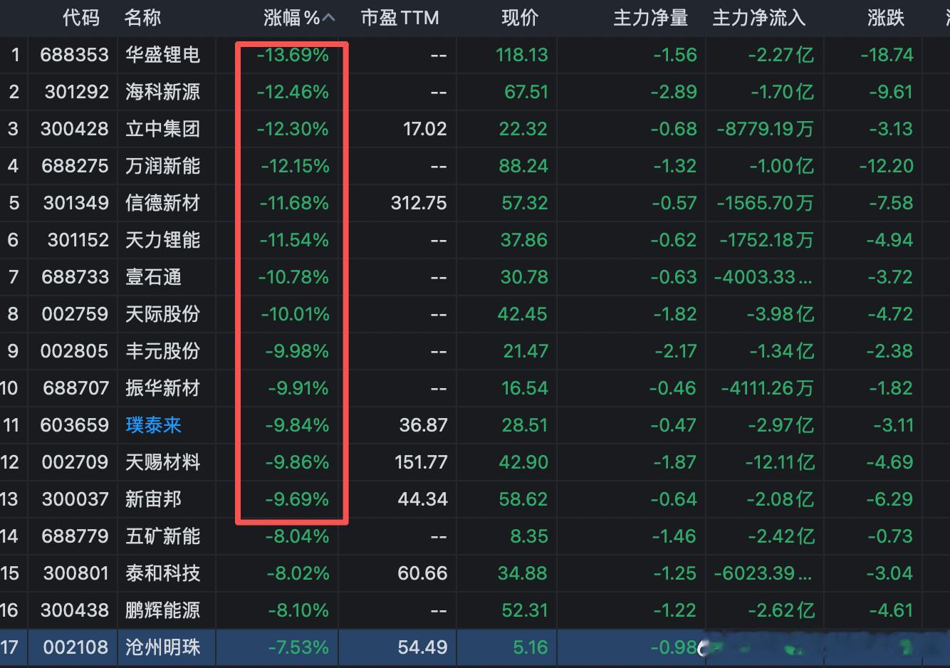 太惨烈了!突发3大利空,13个钠离子电池集体跌停,游资都被埋1年半后达标概率93%?策略代表性指数回测数据最新出炉!了解一下 >华盛锂电113.00-17.44%万润新能89.89-10.50%天力锂能37.67-11.99%最近这段时间太惨烈了,市场中最活跃的资金一下子都被套牢了,虽然指数没怎么跌,但是这段时间热门股集体跌停了,今天钠离子电池有13个股票跌幅超过10%,算是板块大面积集体跌停了吧。而这背后主要有三个利空影响。这种暴跌风险一定要注意!首先我们复盘下今天市场中钠离子电池的表现:华盛锂电,暴跌14%;海科新源,暴跌12.46%;立中集团,暴跌12.3%;万润新能,暴跌12.15%;信德新材,暴跌11.68%;天力锂能,暴跌11.54%;壹石通, 暴跌10.78%;天际股份,暴跌10%;丰元股份,暴跌10%;振华新材,暴跌10%;璞泰来, 暴跌9.84%;天赐材料,暴跌9.86%;新宙邦, 暴跌9.69%;五矿新能,暴跌8%;实际上最近A股港股美股都是暴跌的,这背后是多个利空因素导致的。第一个利空是:美联储转鹰尤其是最近大家可以看到市场对12月份的降息预期大幅降温,一个月前市场认为美联储12月降息的概率是90%,一周之前市场认为降息的概率是70%,现在认为降息的概率掉到40%了,市场认为12月大概率不会降息了。10 年期美债收益率飙升至 4.8%,资金从股市流向安全资产。这是导致港股美股大跌的核心原因。第二个利空是:大股东大幅减持股票刚刚我复盘了的A股三季度有14个超级龙头,都是市值2000亿以上的公司大幅减持股票,其中有东方财富,北方华创这样炒作之后的白马,也有胜宏科技,天孚通信这种热门题材,还有迈瑞医疗,山西汾酒,万华化学这种股价在低位也都在减持,这一波牛市大股东门都走了,散户能炒作起来吗?第三个利空是:10月经济数据还是不太行啊10月份经济数据全方面遇冷,而且即便是热门题材也缺乏业绩和利好支撑,比如钠离子电池这种方向,基本都是炒作,而量化资金行动太快,昨天涨停今天跌停,热门活跃资金都被套牢了。形成非常严重的亏钱效应。