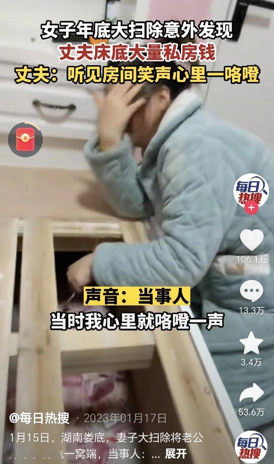 全职主妇大扫除,意外在床底发现丈夫的秘密小金库!丈夫的反应让人哭笑不得 每天宅在家里总觉得无所事事,我决定来一次彻底的大扫除!拖地擦窗忙活了一上午,正准备掀开床垫清理床板,没想到——红彤彤的钞票像秋天的落叶一样铺满了整个床底! 我大声喊来了老公和女儿。老公的脸色瞬间变得苍白,搓着手支支吾吾地说:“这些…这些都是我为你准备的惊喜…”女儿则兴奋地举着手机狂拍:“爸,您这藏钱技术可以开个培训班了!” 仔细一数,竟然有三万八!老公坦白说,这些都是他这些年加班费一点一点攒下来的,本来想在我生日时买个金镯子。你说这丈夫藏得深不深?愣是把“最危险的地方最安全”这句话实践得淋漓尽致! 网友们调侃说这是“扫地僧式致富”——谁能想到大扫除真能扫出财富密码?不过话说回来,夫妻之间哪需要藏着掖着。我们家这次说开了反而更暖心,老公主动把银行卡密码全交代了,还承诺下次直接带我去专柜挑镯子! 惊喜永远藏在生活细节里!你们家那位藏私房钱有过什么神操作?快来评论区晒晒!