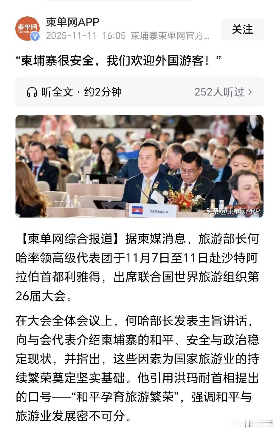 柬埔寨🇰🇭何哈部长发表主旨讲话 “柬埔寨很安全,我们欢迎外国游客” 柬埔寨部长向与会代表介绍柬埔寨的和平、安全与政治稳定现状,并指出,这些因素为国家旅游业的持续繁荣奠定坚实基础。他引用洪玛耐首相提出的口号——“和平孕育旅游繁荣”,强调和平与旅游业发展密不可分。