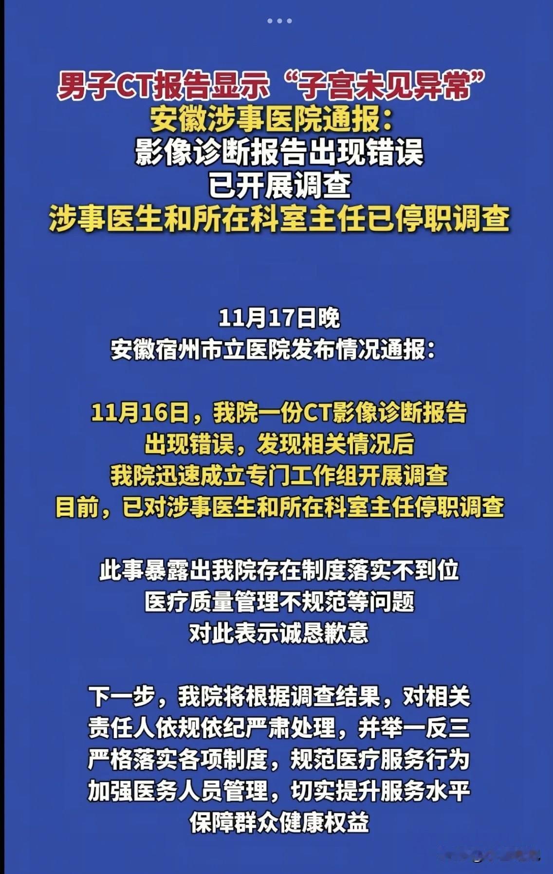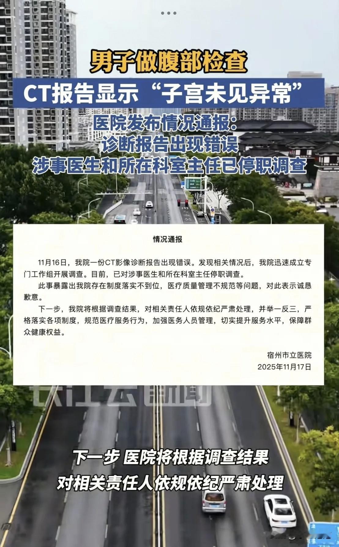 “太荒唐了!”安徽宿州,一男子到医院看病,拿到CT报告单后,一下子傻眼了,不是被病情吓到了,而是报告结果赫然写着:“子宫及双侧附件未见明显异常。”男子当即认为这份报告有假,气得当场找医院讨说法! 这则离谱的医疗乌龙迅速引发热议。从报告来看,患者为男性,检查部位是腹部,却出现“子宫及双侧附件未见明显异常”的描述,明显是模板使用错误,将女性检查模板误用在男性患者身上。 事件曝光后,涉事的宿州市立医院于11月17日发布通报,承认CT影像诊断报告出现错误,已对涉事医生和所在科室主任停职调查,同时坦言医院存在制度落实不到位、医疗质量管理不规范等问题,并表示会根据调查结果对相关责任人依规依纪严肃处理,还将举一反三,严格落实制度、规范医疗服务行为。 此类医疗差错并非个例,此前也有类似因模板误用、医生疏忽导致的报告错误事件。这暴露出部分医院在医疗文书管理、医生操作规范等环节存在漏洞。医疗诊断关乎患者健康甚至生命,每一个环节都应严谨细致,容不得半点马虎。患者就医本就心怀忐忑,如此低级的错误不仅会引发患者对医院专业性的质疑,更可能在一定程度上耽误病情或造成不必要的困扰。 希望医院能以此次事件为契机,切实加强管理,完善流程,避免类似情况再次发生,也给患者一个安心、可靠的就医环境。 各位读者你们怎么看?欢迎在评论区讨论。