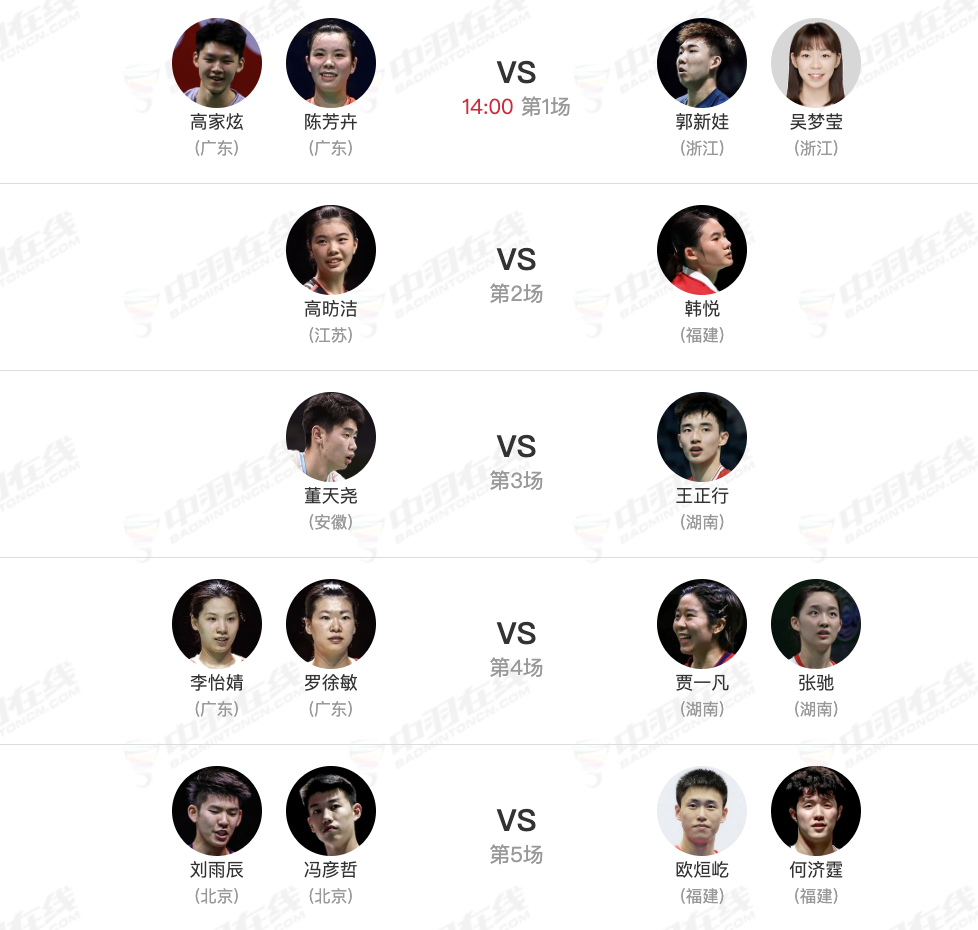 羽毛球单项赛11月19日季军赛赛程,下午14点开赛: 混双:高家炫?陈芳卉(广东)🆚(浙江)郭新娃/吴梦莹女单:高昉洁(江苏)🆚(福建)韩悦 男单:董天尧(安徽)🆚(湖南)王正行女双:李怡婧/罗徐敏(广东)🆚(湖南)贾一凡/张驰男双:刘雨辰/冯彦哲(北京)🆚(福建)欧烜屹/何济霆