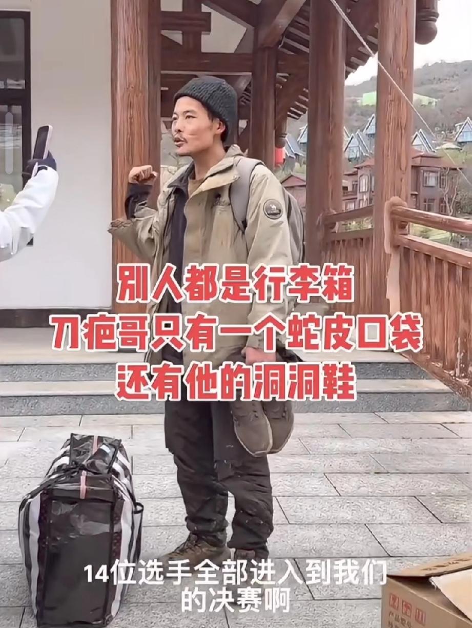 刀疤哥还挺讲究,来的时候用的十块钱一个的蛇皮袋,而不是用的尿素袋子。 越来越喜欢刀疤哥了,朴素简单直率,大家住酒店休整拿自己的行李入住,别人用的都是行李箱,而刀疤哥用的是十元钱一个的蛇皮袋子。 这就是底层人的真实生活,这个还算崭新的蛇皮口袋已经是刀疤哥的体面了。 来到荒野竞赛场上,刀疤哥不卑不亢,和那些医学生大学生大老板们公平竞争,给普通人一次被看到的机会。