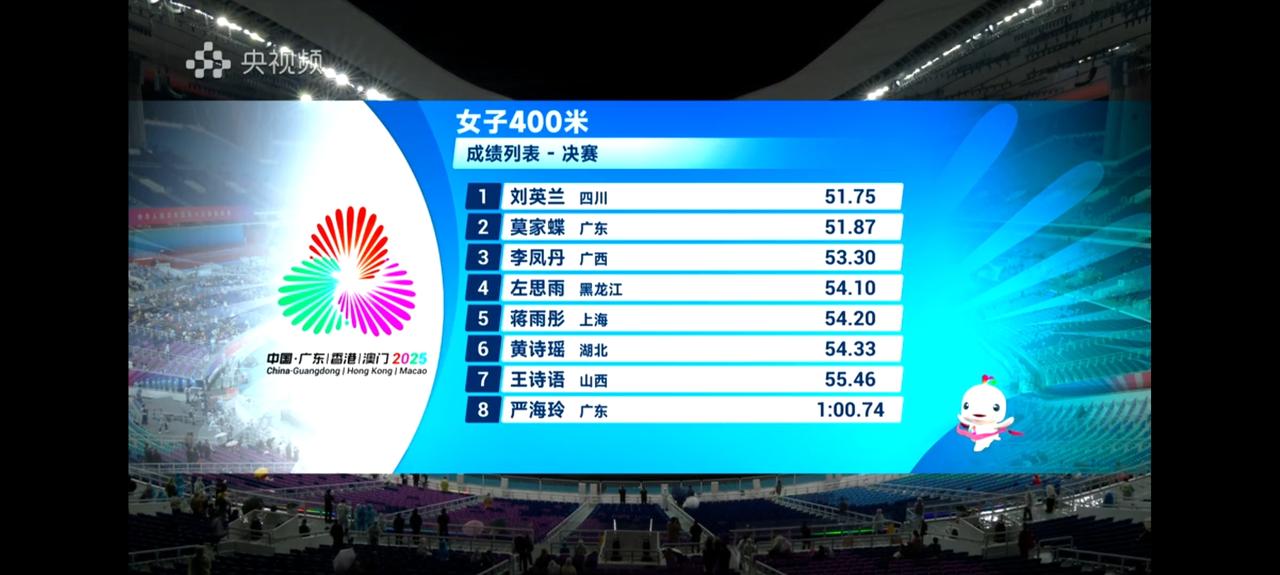 女子400米正式进入刘英兰时代,在刚刚结束的全运会女子400米决赛,四川的刘英兰正面击败国家队队友莫家蝶,获得冠军,并且把自己的PB提高了一秒。 刘英兰51.75 莫家蝶51.87 在所有8位选手中,52秒区间断档。 所以女子400米形成双寡头。 祝贺刘英兰。