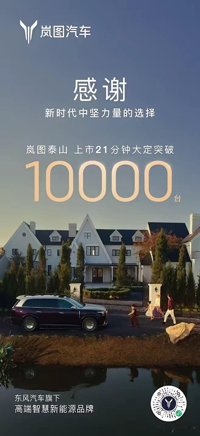 岚图泰山上市21分钟大定突破10000台!看来这车又成了! 40万的车,超10000台的大定,这订单足够岚图消化一段时间了,岚图常规的15000+的月销量再加上泰山这火热的爆单,下一个看来有望达成月销2万台了。 岚图目前可以说是国家队车企新能源的天花板了,不管是阿维塔还是红旗的新能源,目前都没有达到岚图的高度。 岚图真的是成功了,下一步就是成功上市了!