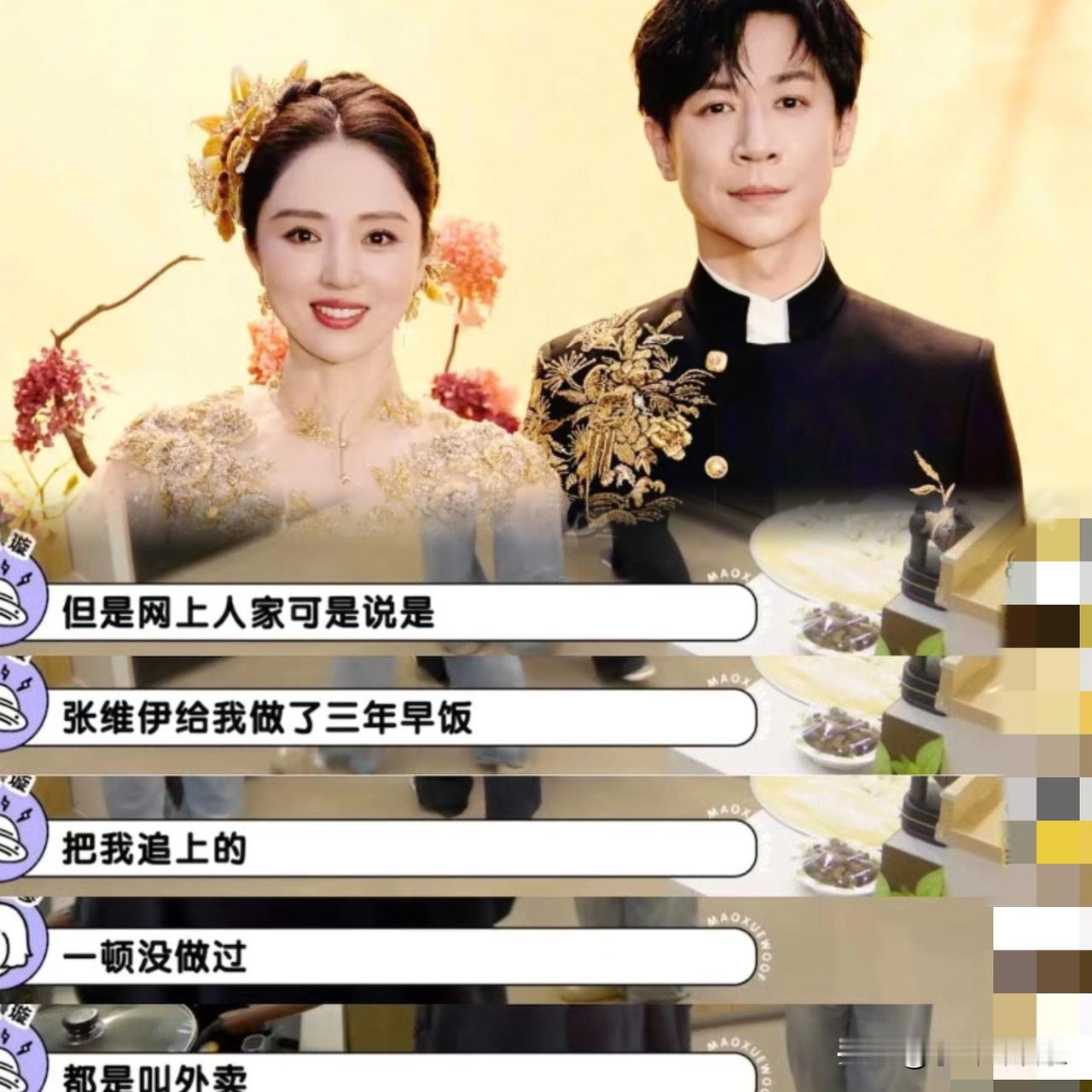 董璇又辟谣了 直接戳破张维伊为追她做三年早饭的传闻,直言男方根本不会做饭,也从没给她做过饭,平时全靠点外卖,合着是大家给记混了,给姐姐做饭的是金莎的小男友。 不过话说回来,那就更让人好奇了,两人无论是经济差距、还是颜值都不搭。张维伊追董璇时到底靠啥?他到底有啥魅力,能让董璇那么坚定的选择他?