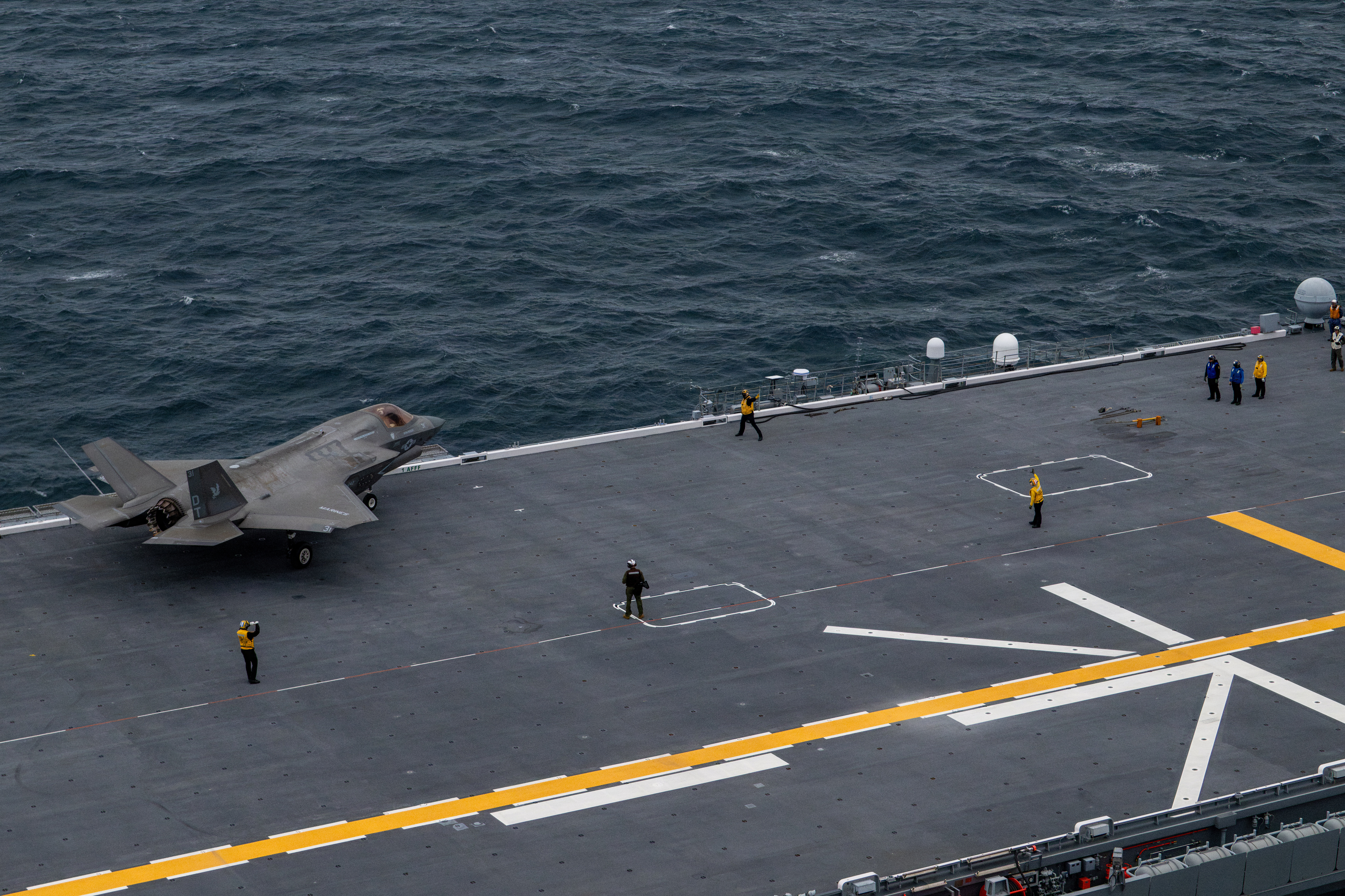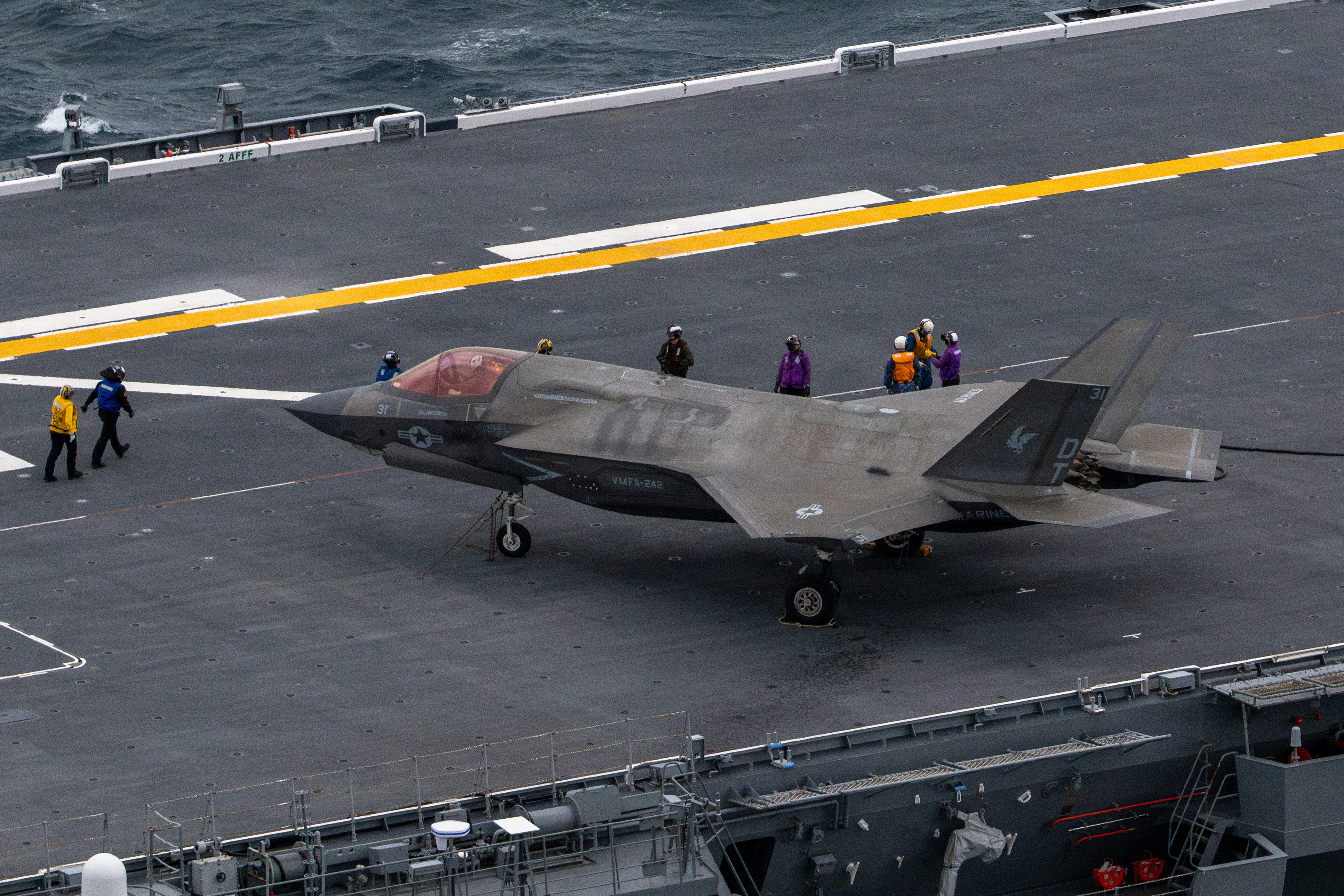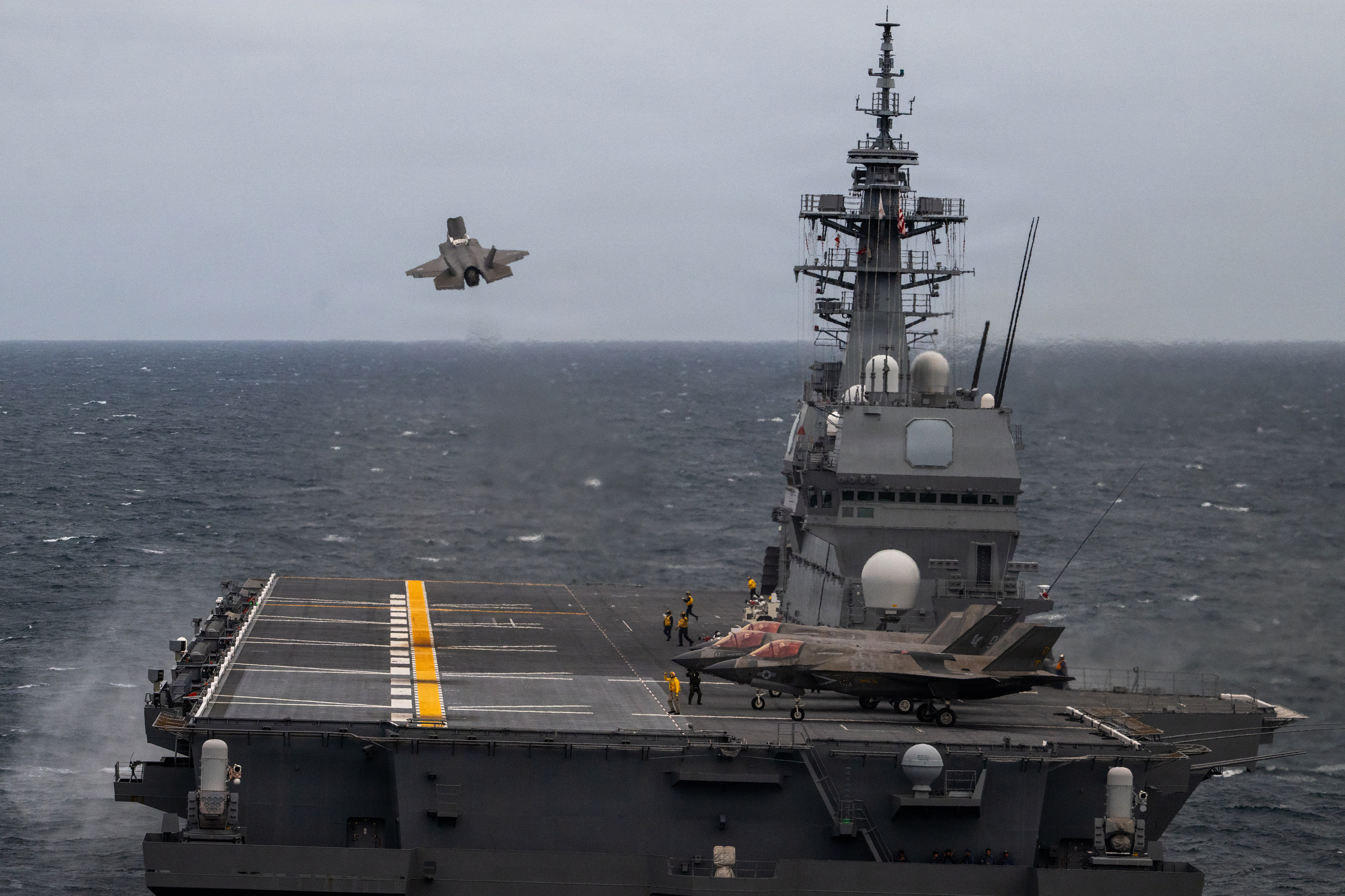 美军今天放出了上月在菲律宾海,日本海上自卫队 “加贺”号直升机驱逐舰与美国海军陆战队 F-35B 进行联合飞行训练的图片,至少有4架美军F-35B上舰训练。