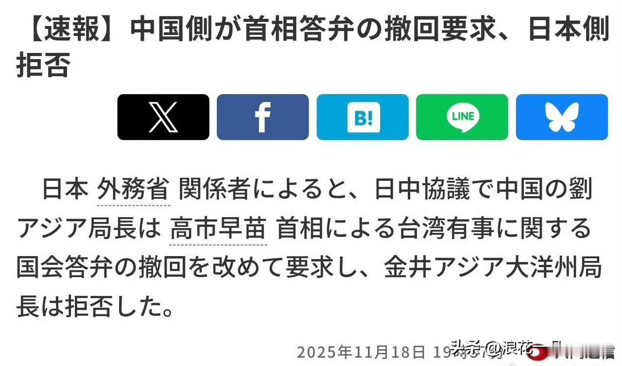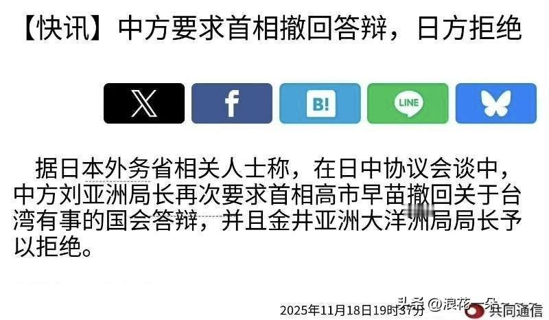 快讯! 看了一下日媒报道:磋商结果算是出来了,重点之一是金井正彰代表日方拒绝撤回高市言论? 当然了,不知道这个信息准不准,因为这是日本媒体发的,我在想是不是给日本老百姓看的呢?[捂脸] 如果这个信息是真实的,那么就可以看出日本根本就不想认错。这也说明我们这几天对日方相关举措是对的,比如说:留学提醒,旅游提醒,暂缓日本电影上映! 我看,还是放弃幻想吧。 用网友的话说:给脸不要脸,该上强度了。反正日本再折腾下去,就是死路一条。