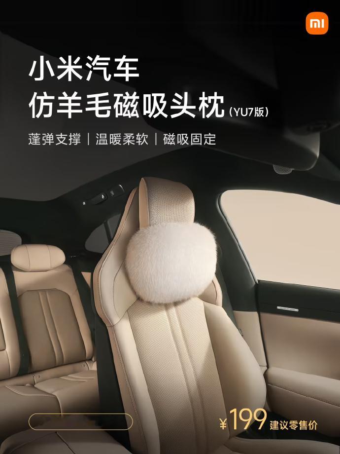 11月17日, 宣布,车生态周边产品新增仿羊毛款磁吸头枕(YU7版)、仿羊毛坐垫套装、仿羊毛车载腰靠等,很适合冬天出行使用,将于明早10:00正式开售。此外,小米YU7还可搭配4K云台摄像头、AI空间交互传感器、前排座椅背板平板支架、后排顶棚滑轨灯、投影仪等。